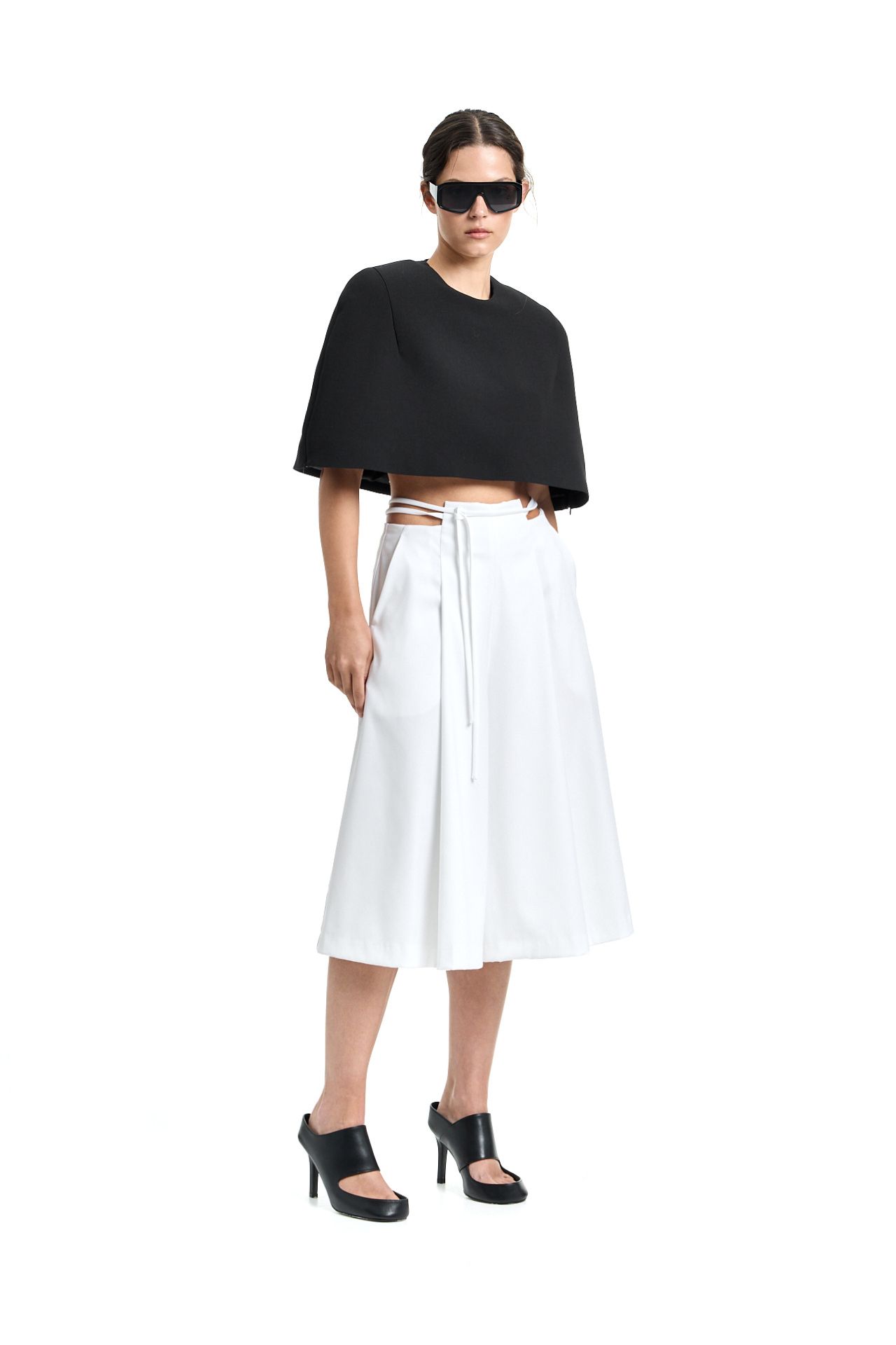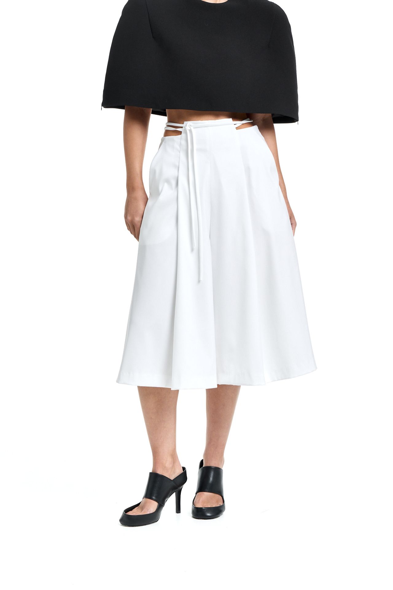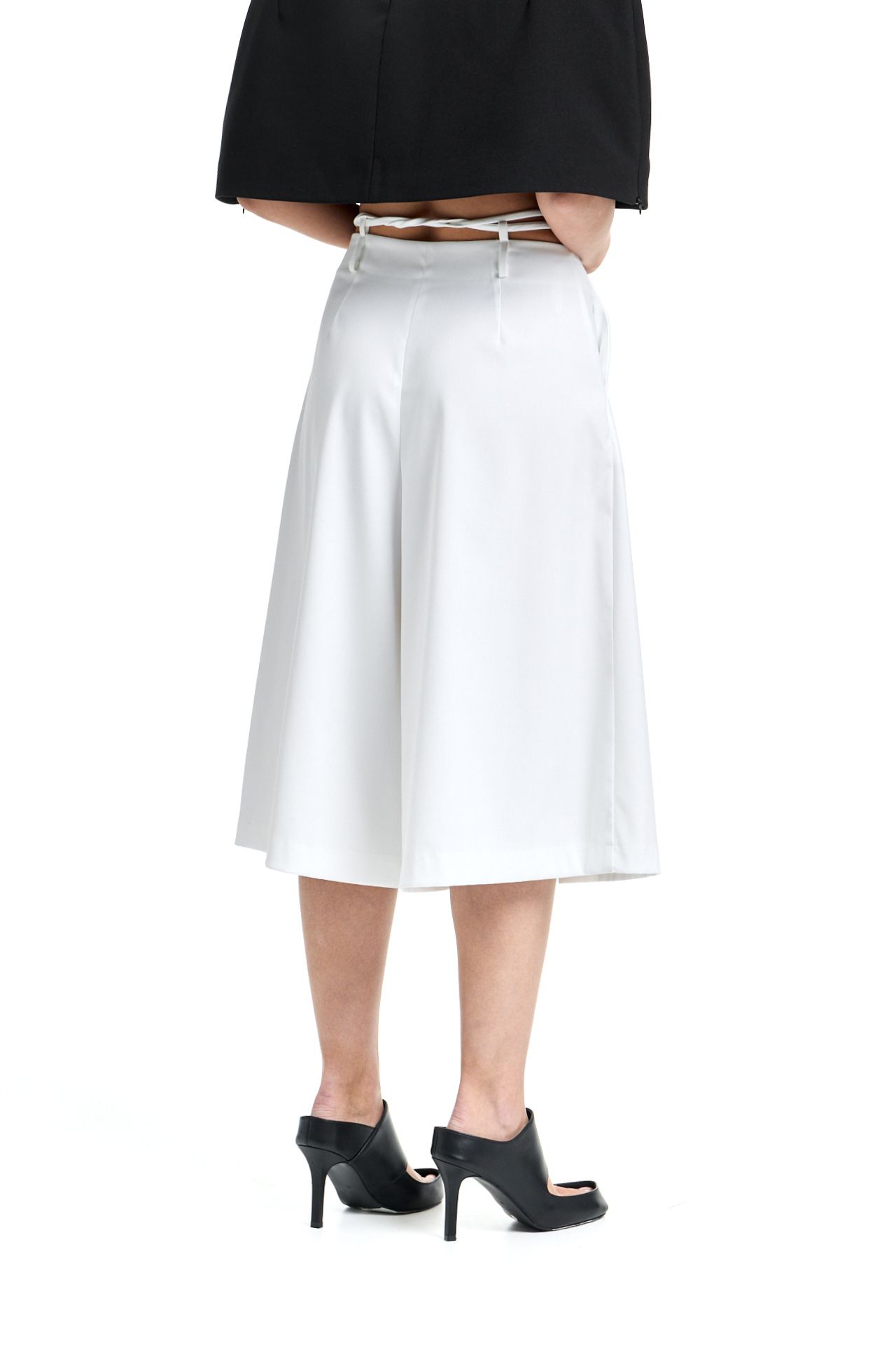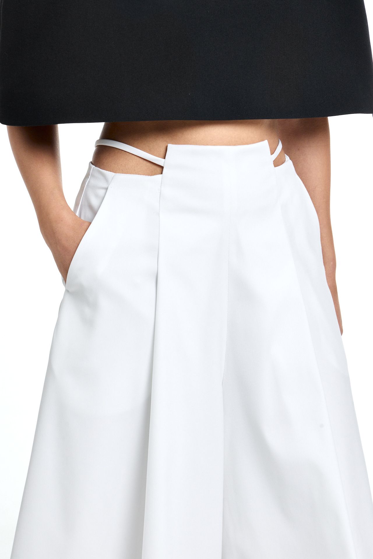 Экстра-широкие бермуды с боковыми карманами на заниженной посадке. Нетривиальный пояс-шнурок. Застежка в виде боковой потайной молнии