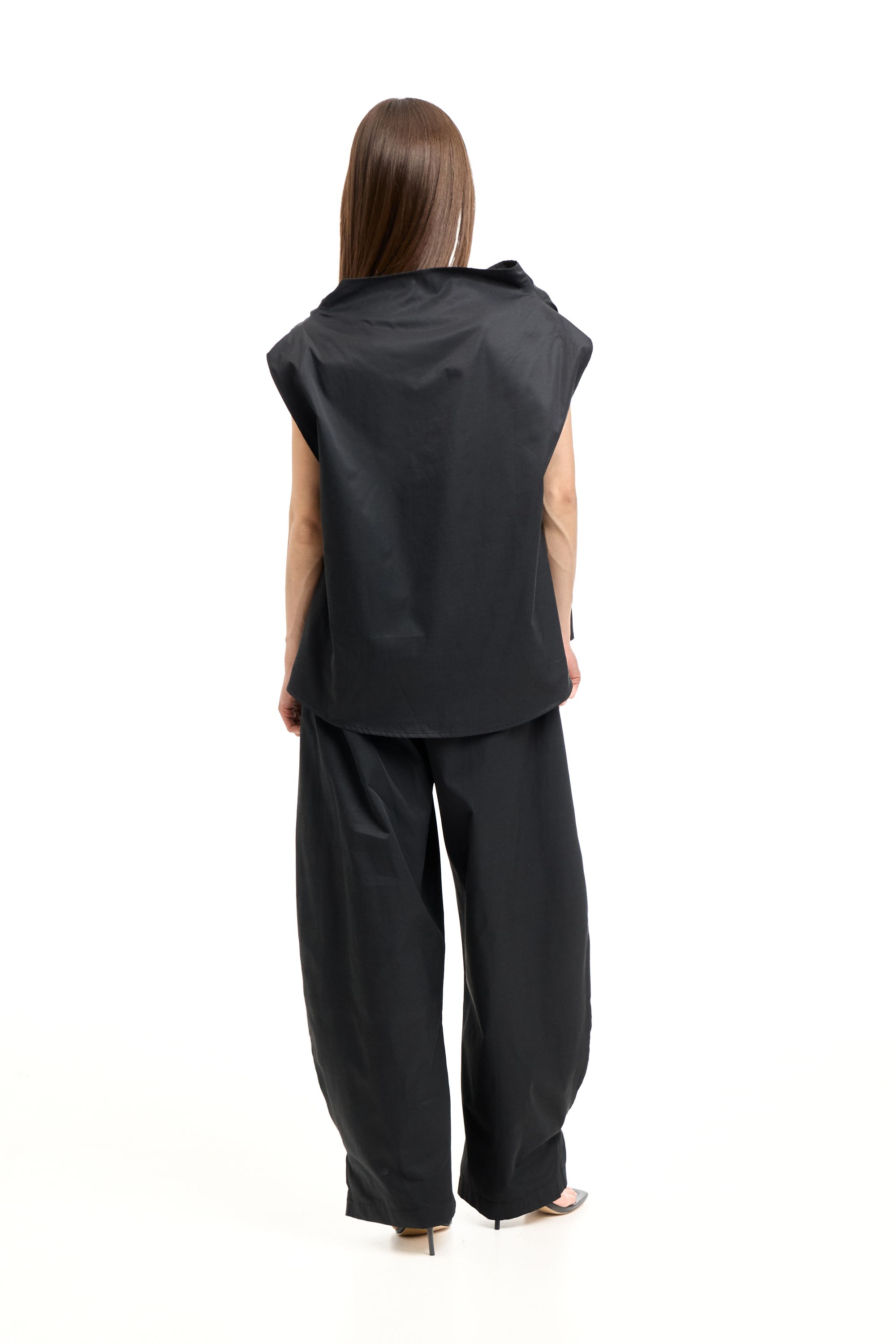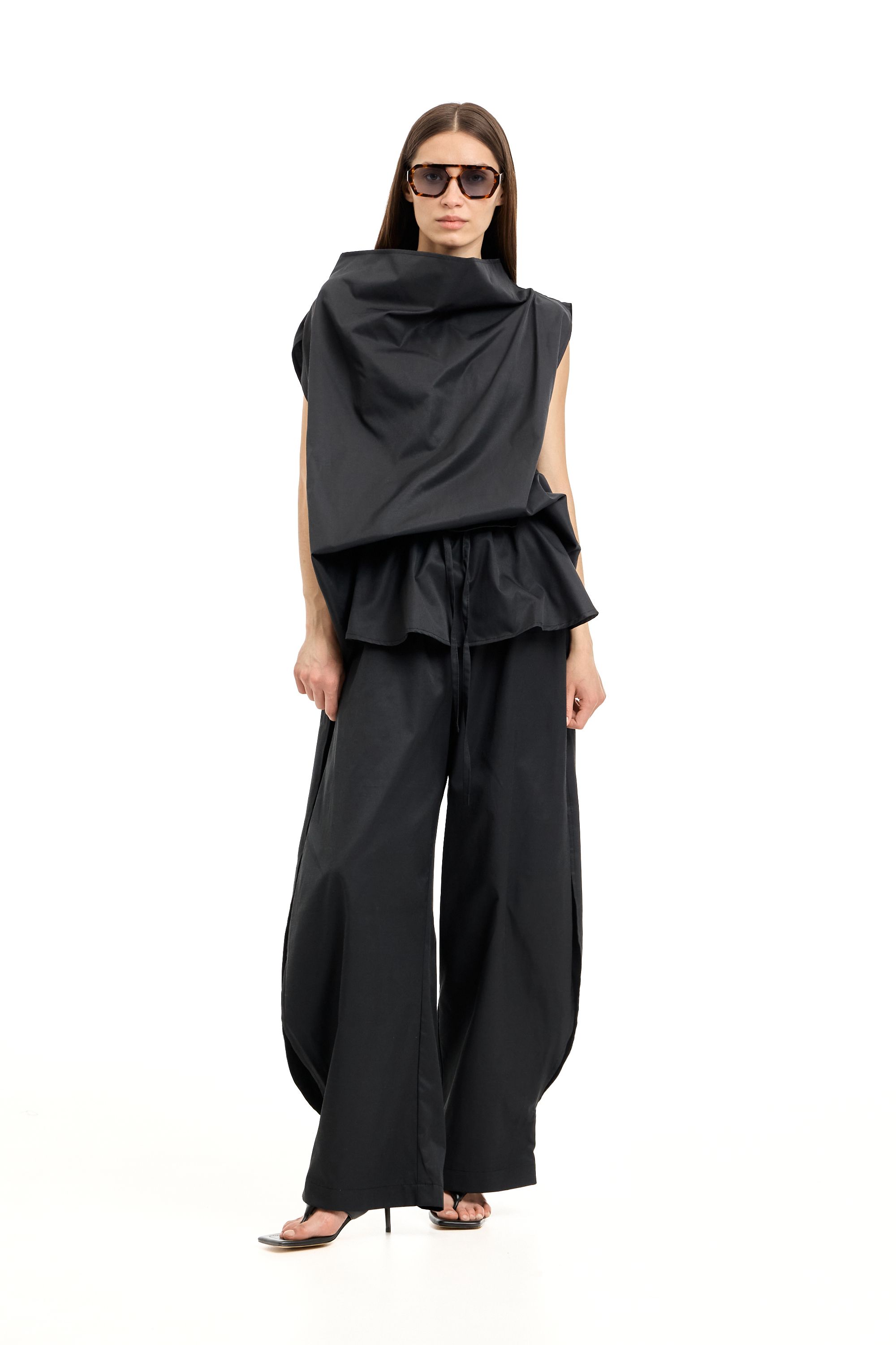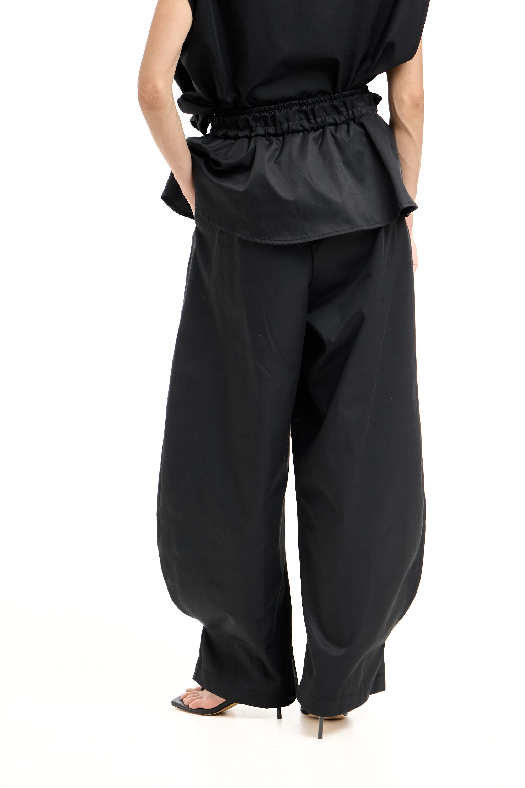 Легкие брюки О-силуэта с интересными деталями - это боковые разрезы на штанинах и съемная баска-волан. Боковые карманы