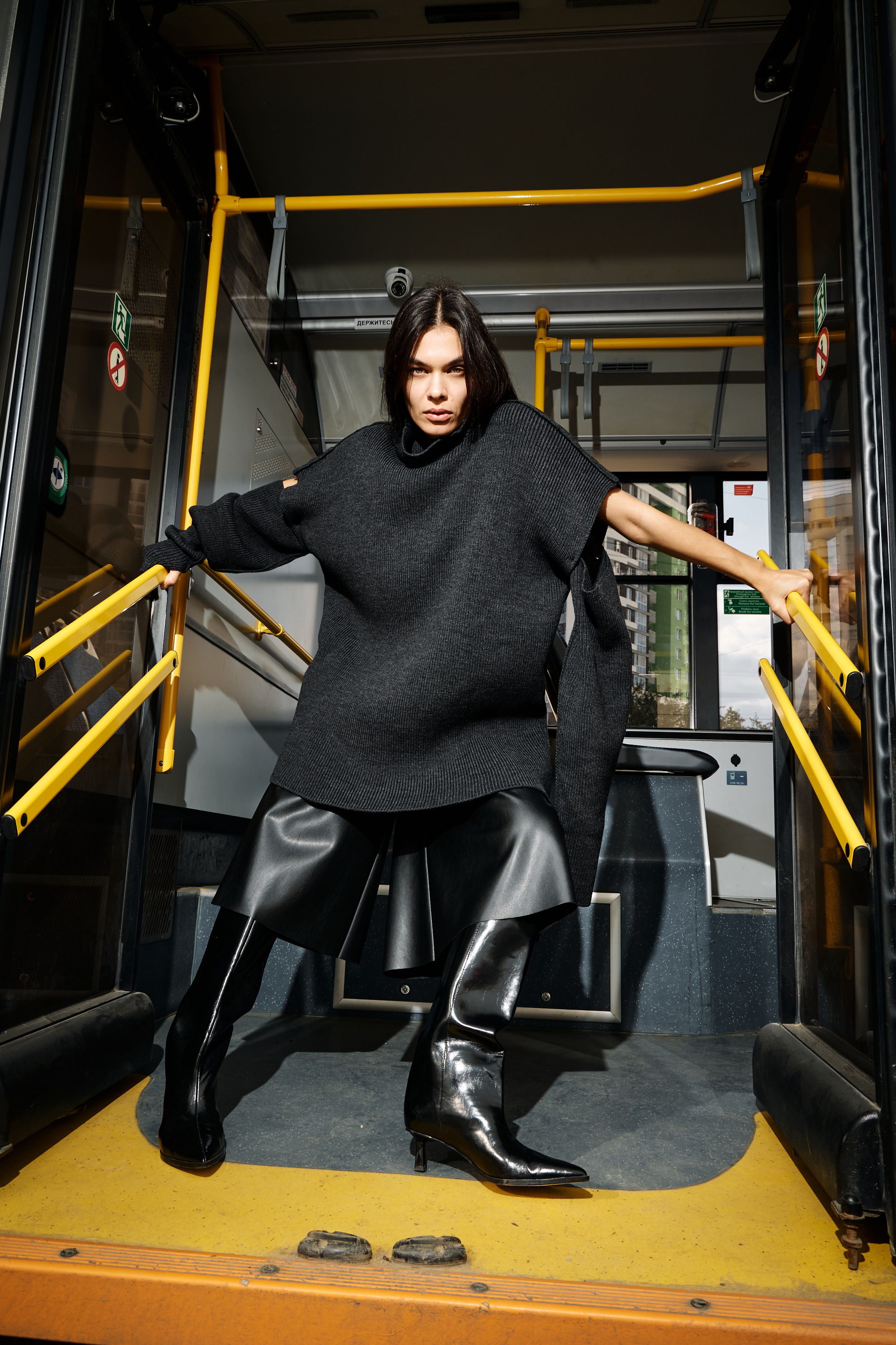 Вязанный джемпер с воротом и акцентными разрезами на рукавах. Рукава-митенки отстегиваются. Застежки на пуговицах