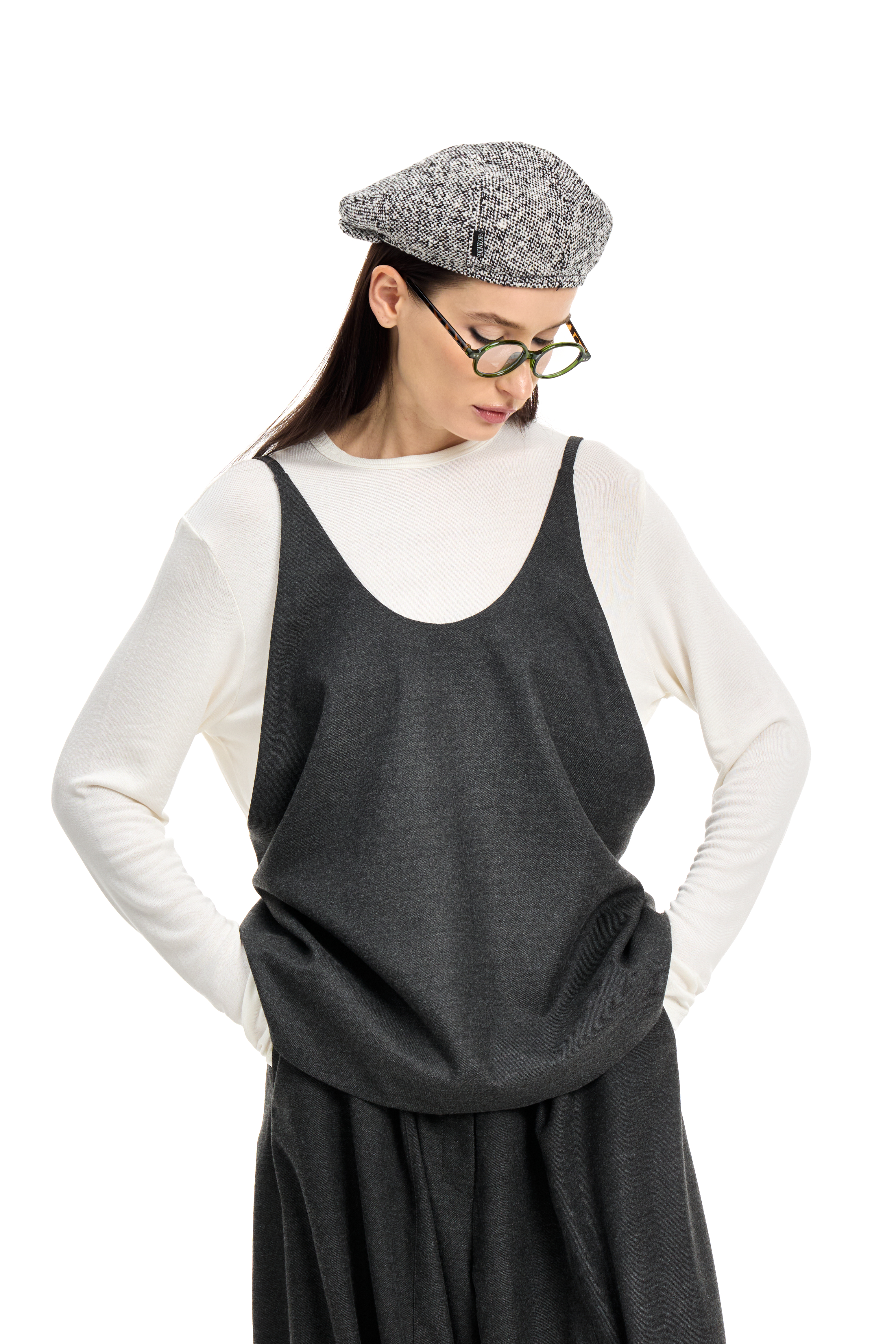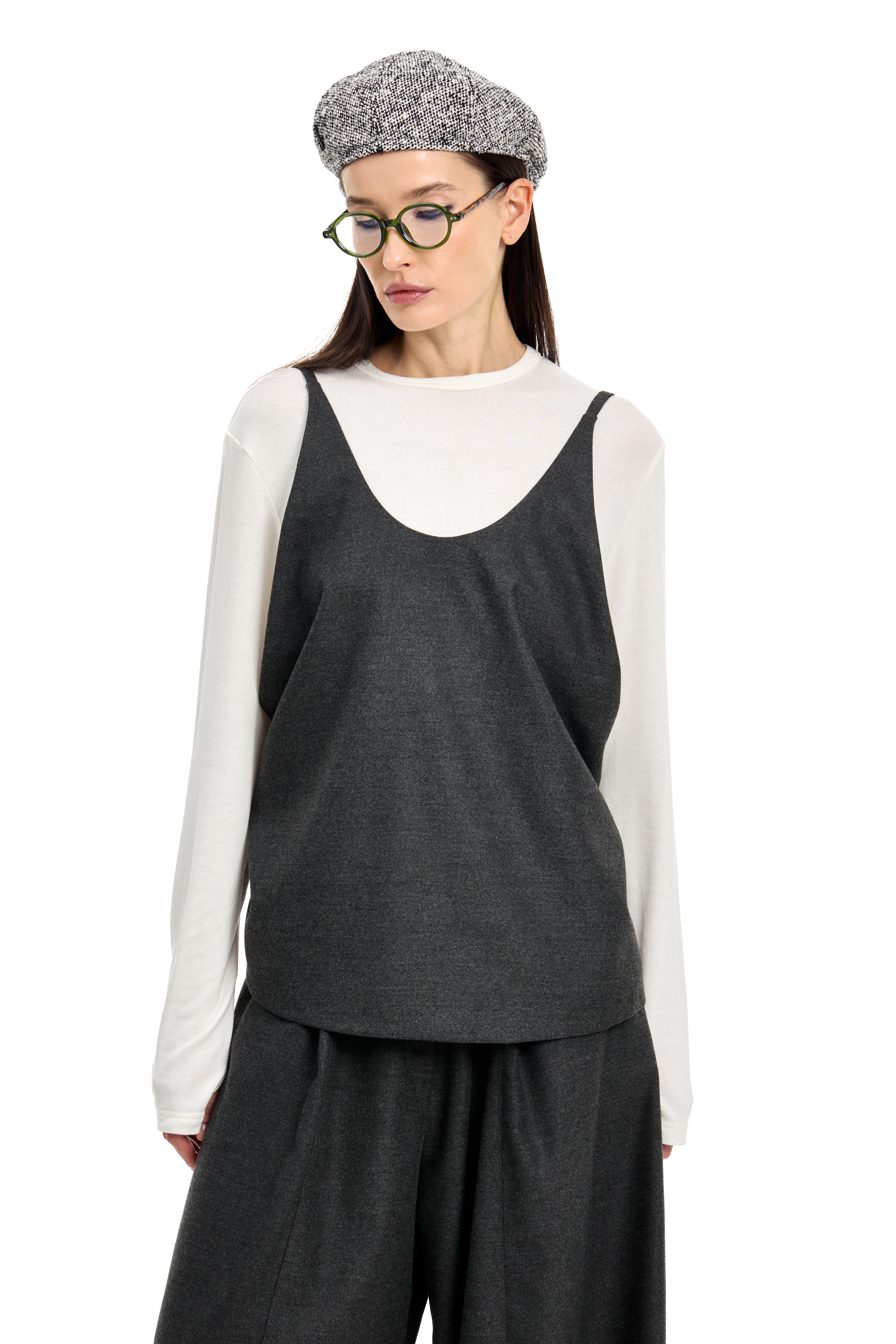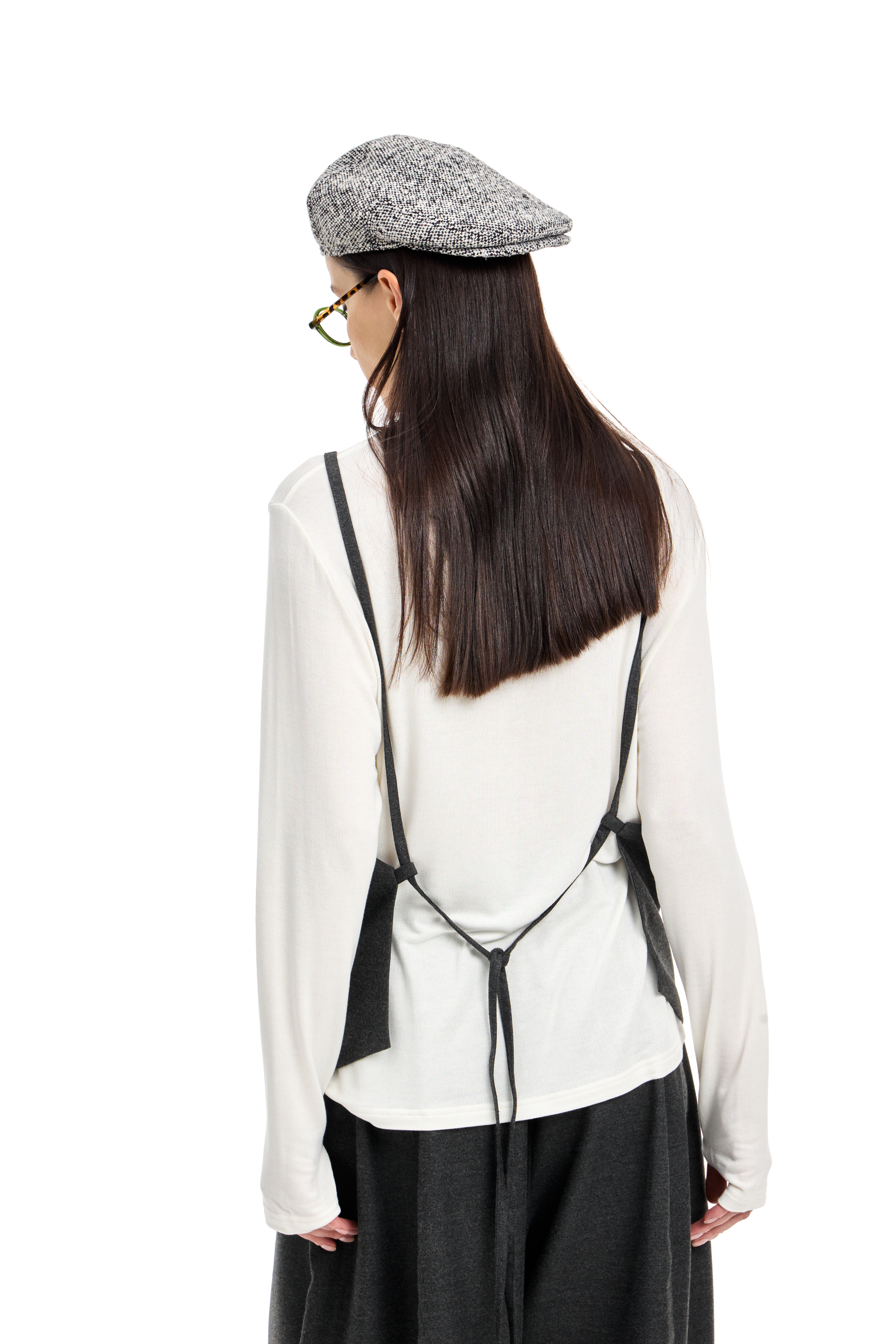 Укороченный фартук-баска с открытой спиной. Завязки на лямки. В сочетании с брюками ROUGE создают имитацию комбинезона