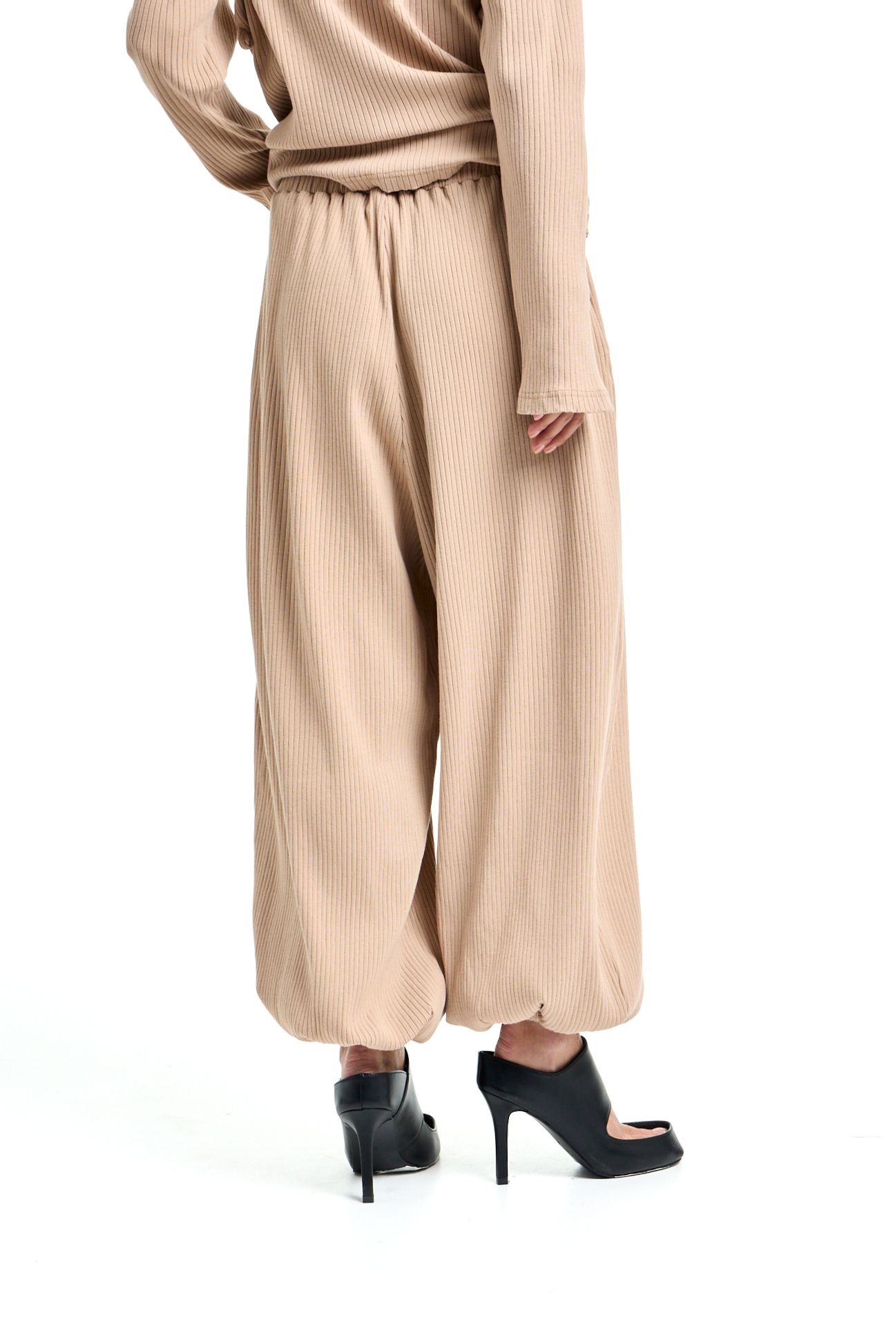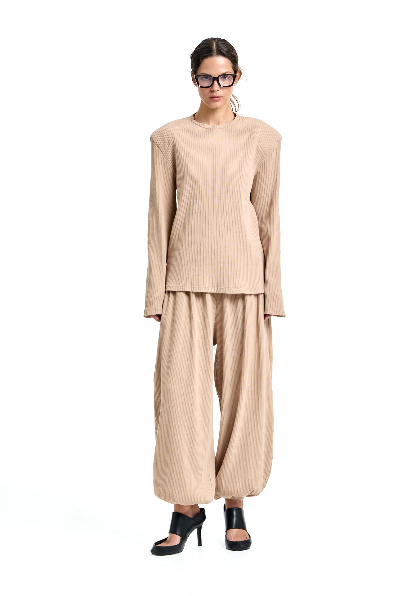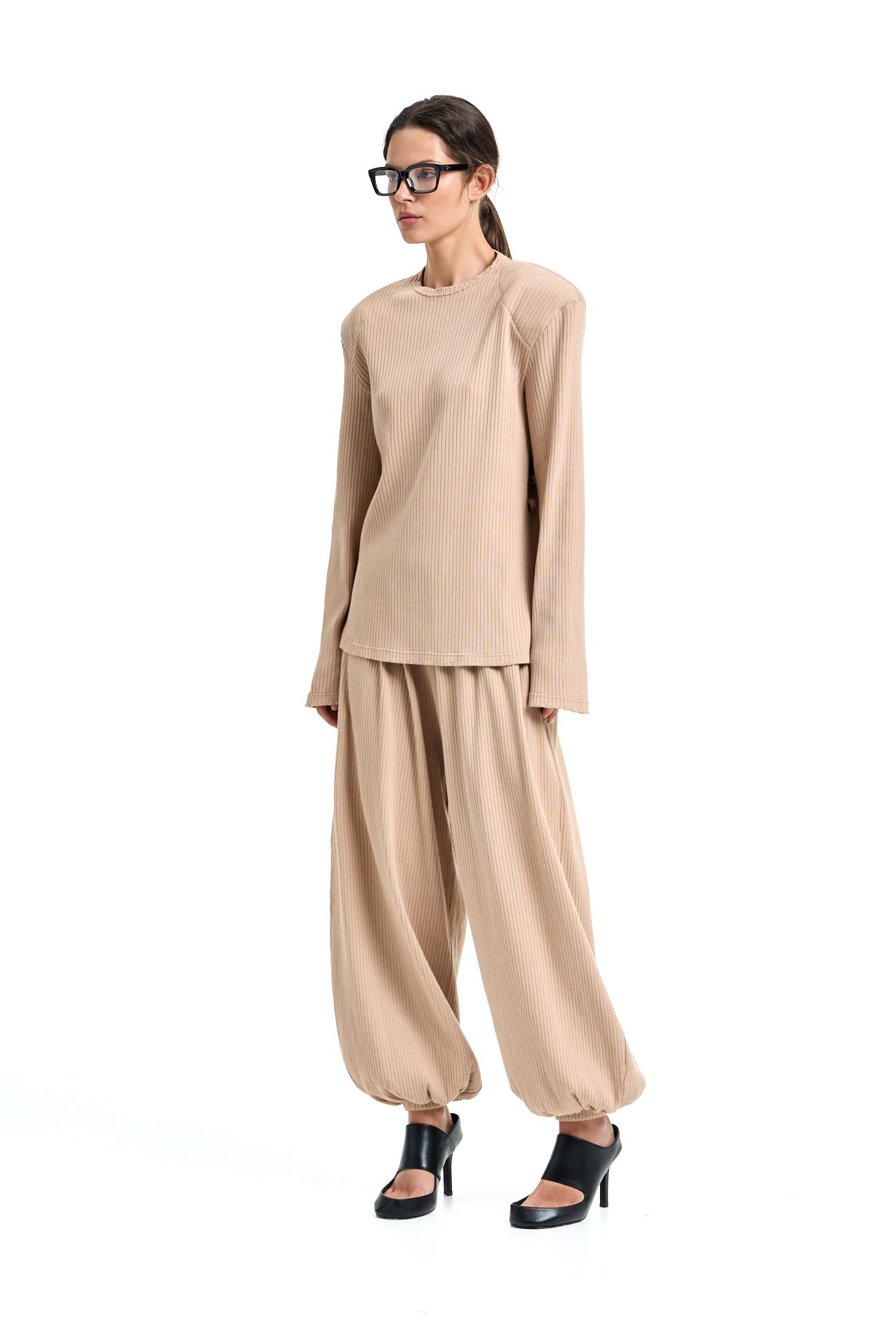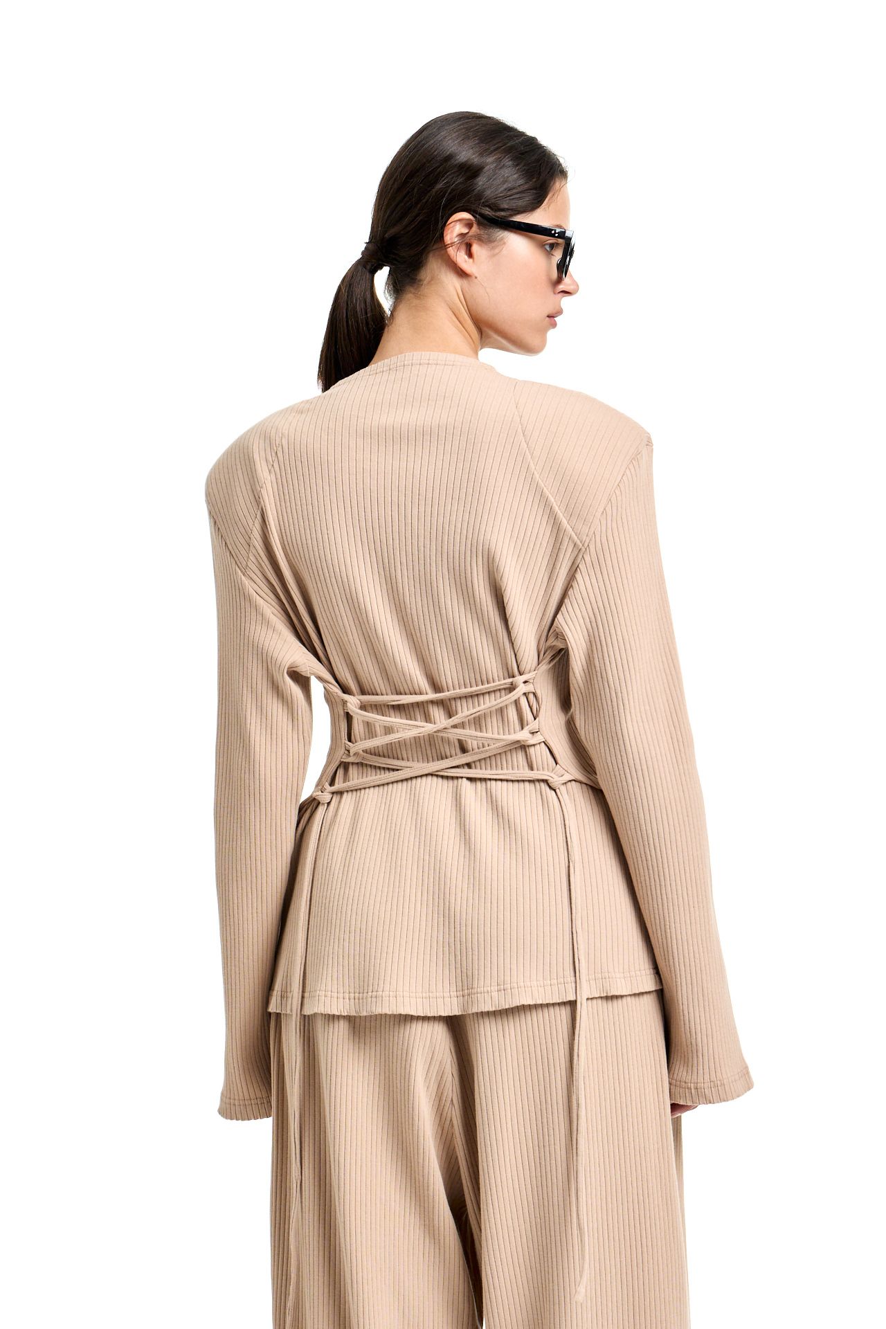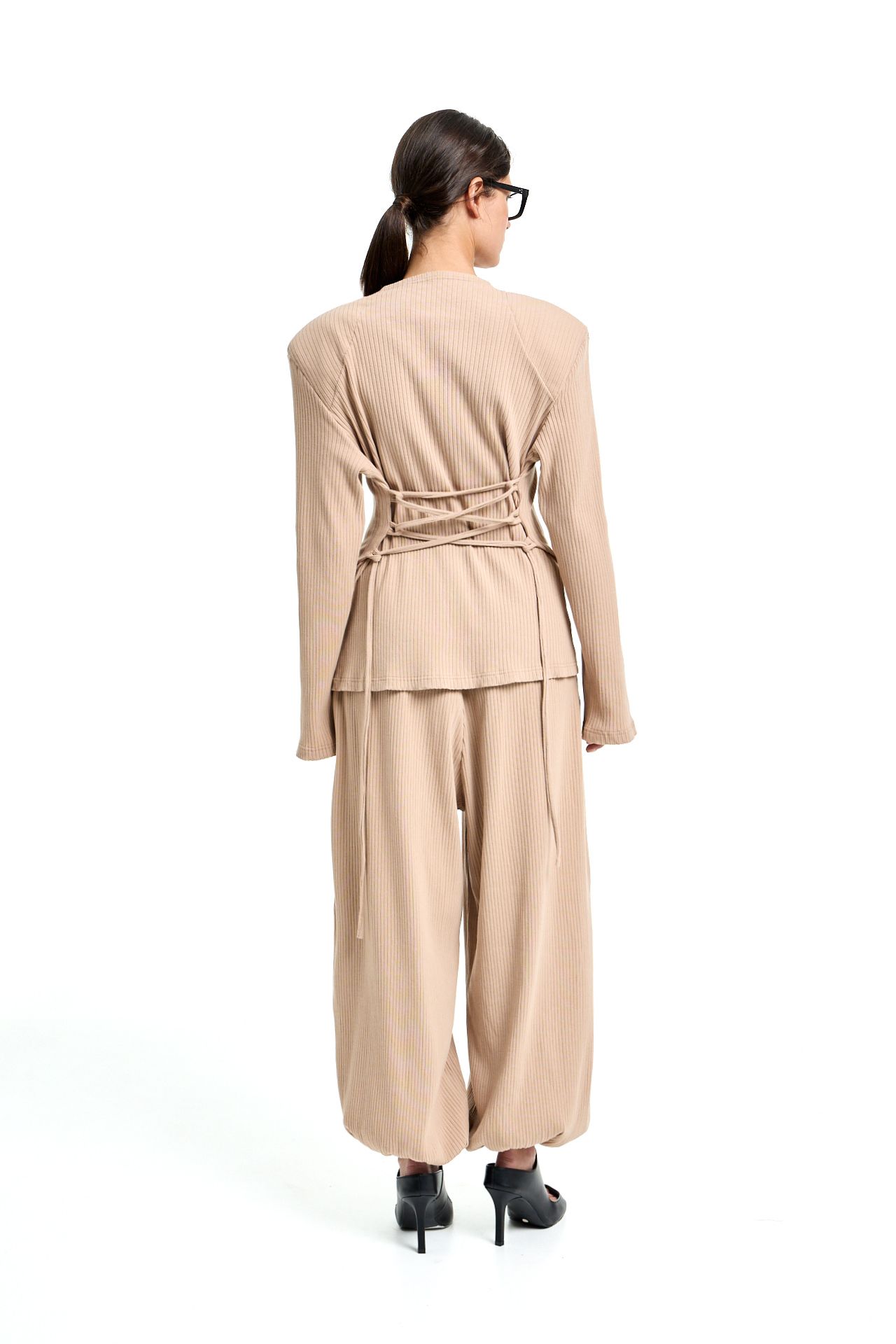 Трикотажный костюм из хлопка. Комплект состоит из лонгслива с корсетной стяжкой на спине и широких брюк на поясе резинке. Брюки О-силуэта, боковые карманы. Лонгслив свободного кроя с акцентными плечами