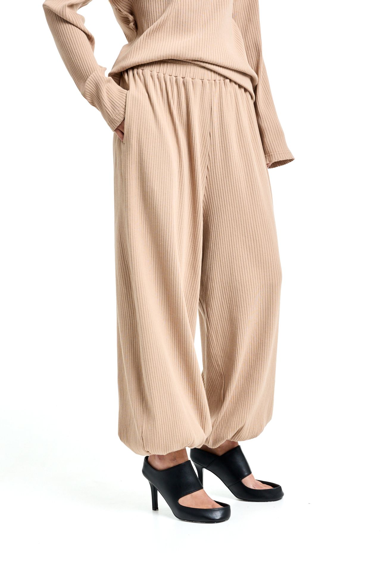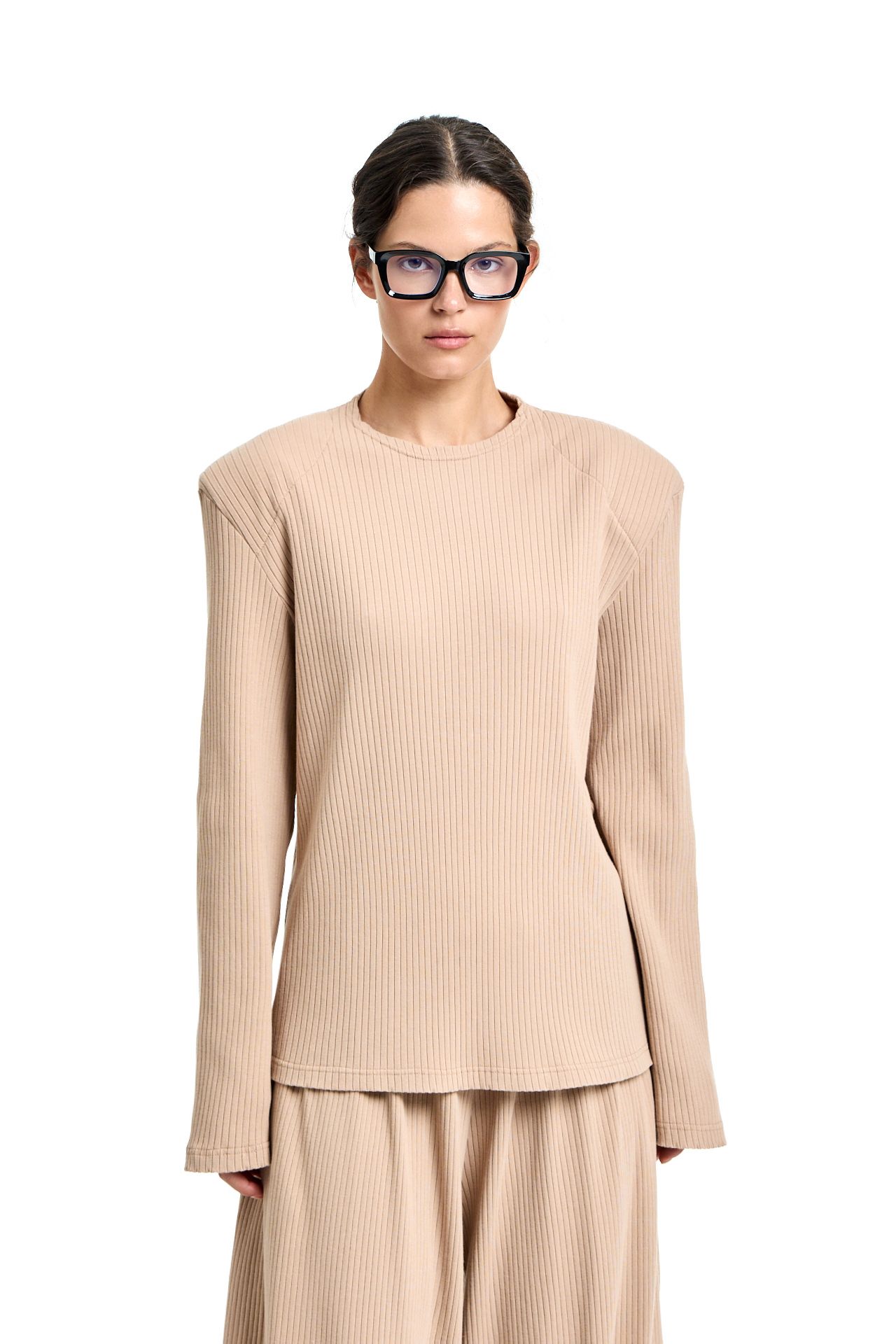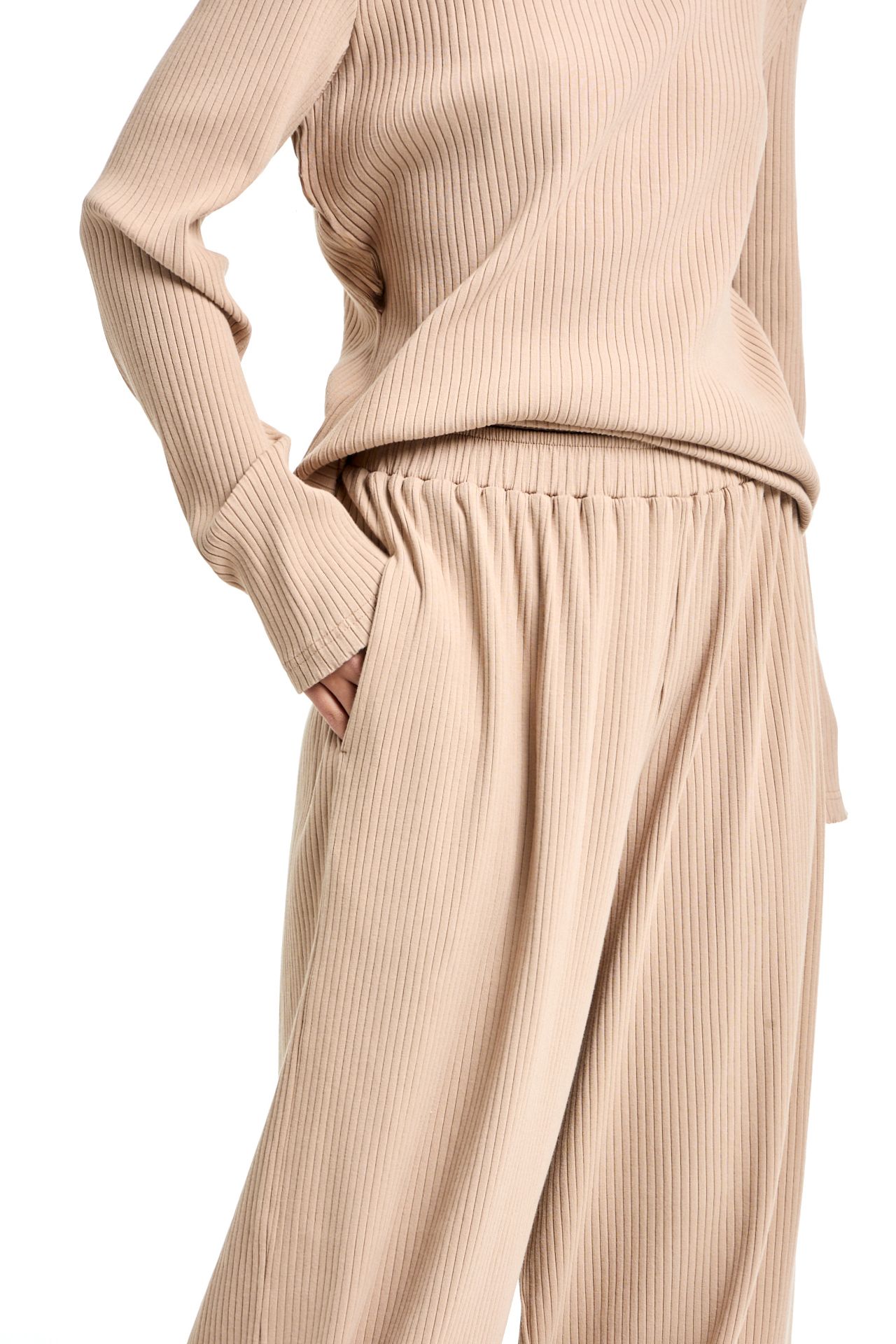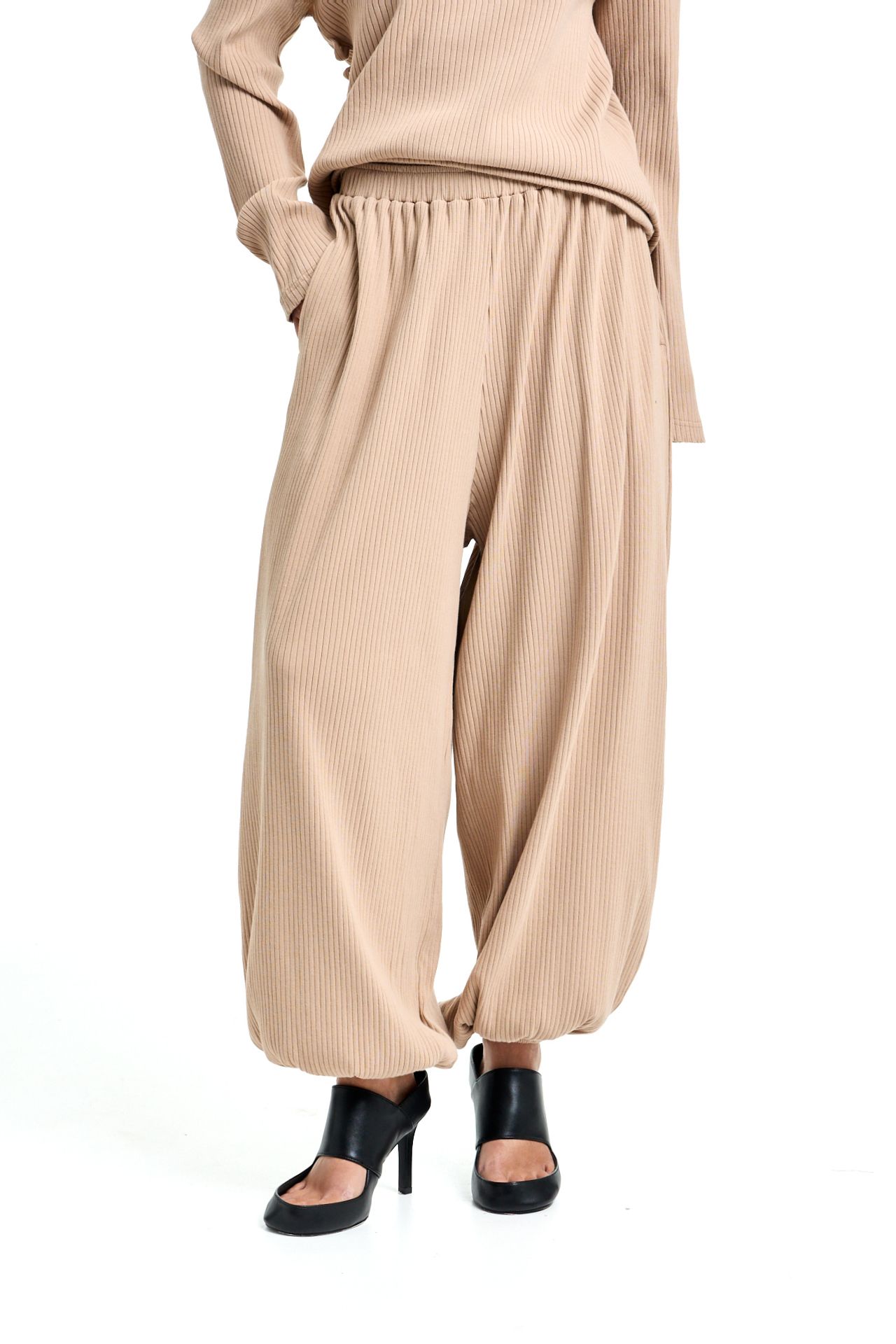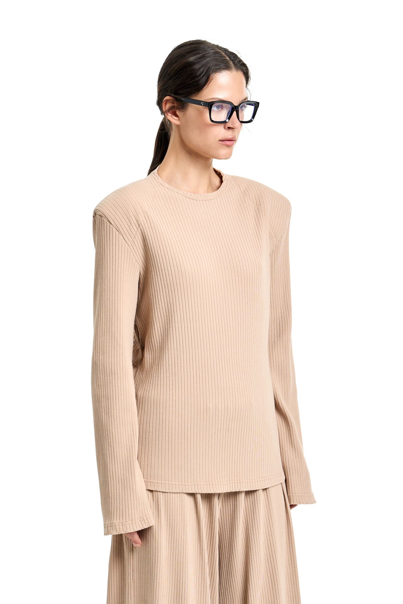 Трикотажный костюм из хлопка. Комплект состоит из лонгслива с корсетной стяжкой на спине и широких брюк на поясе резинке. Брюки О-силуэта, боковые карманы. Лонгслив свободного кроя с акцентными плечами