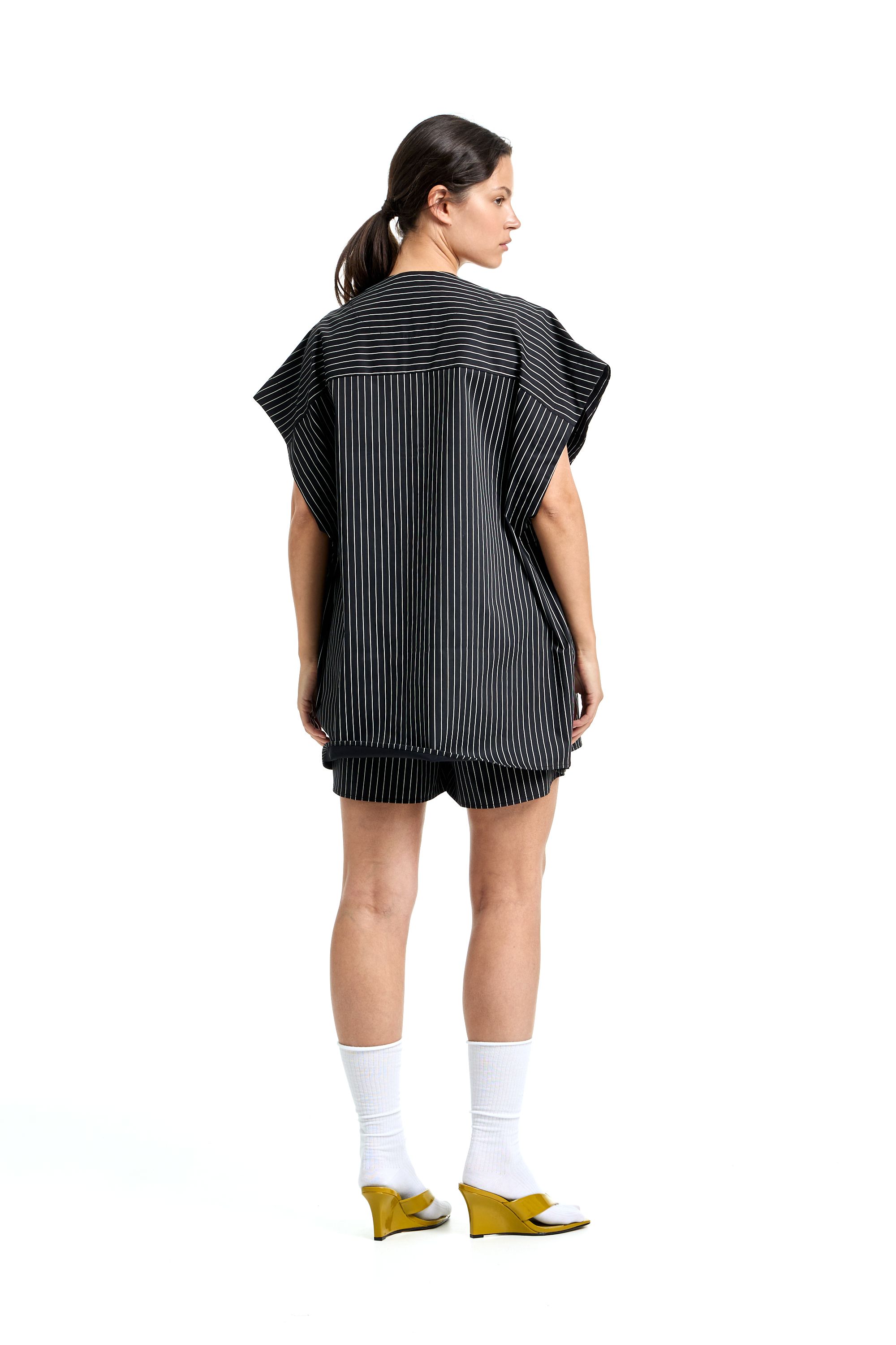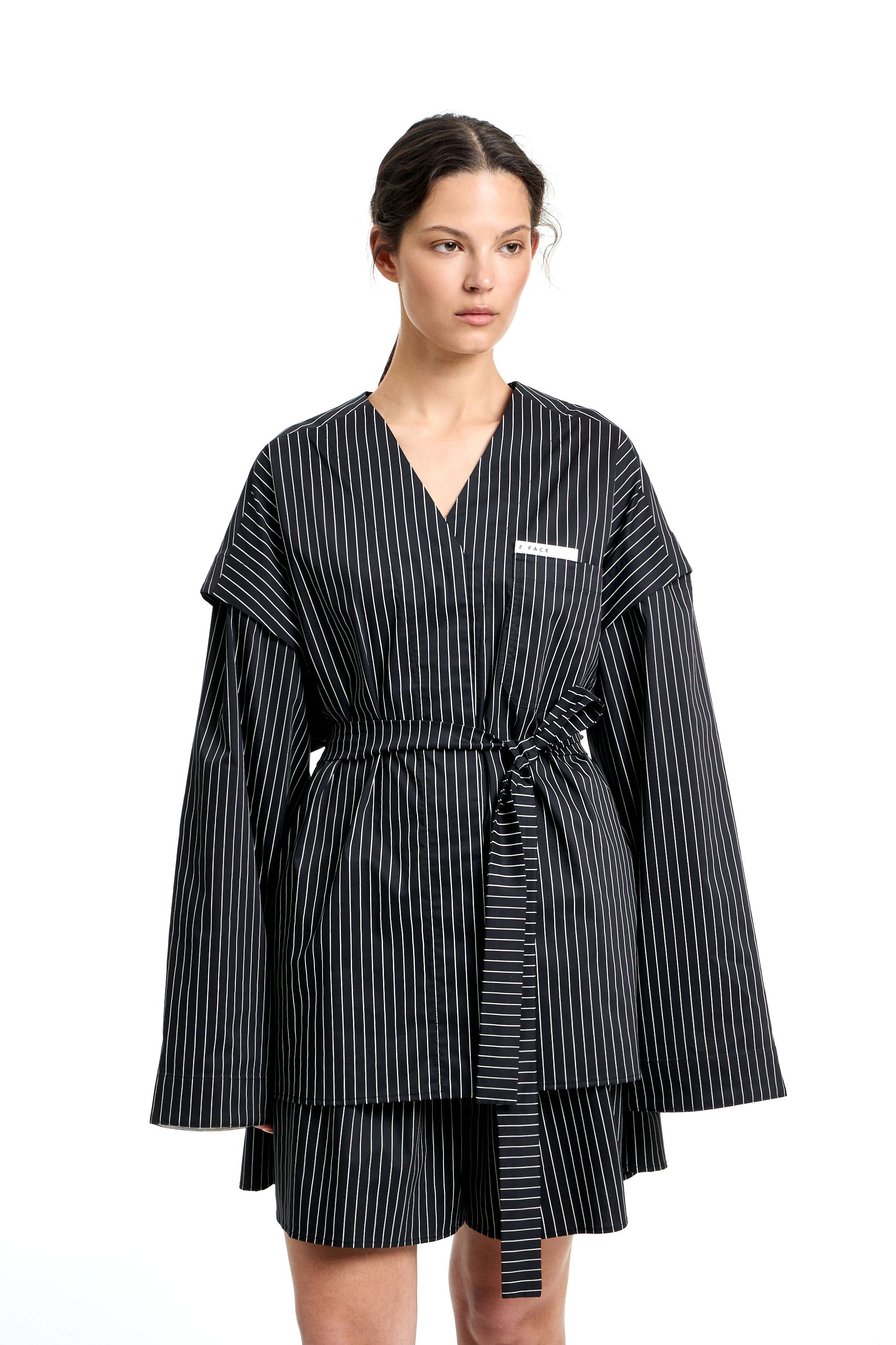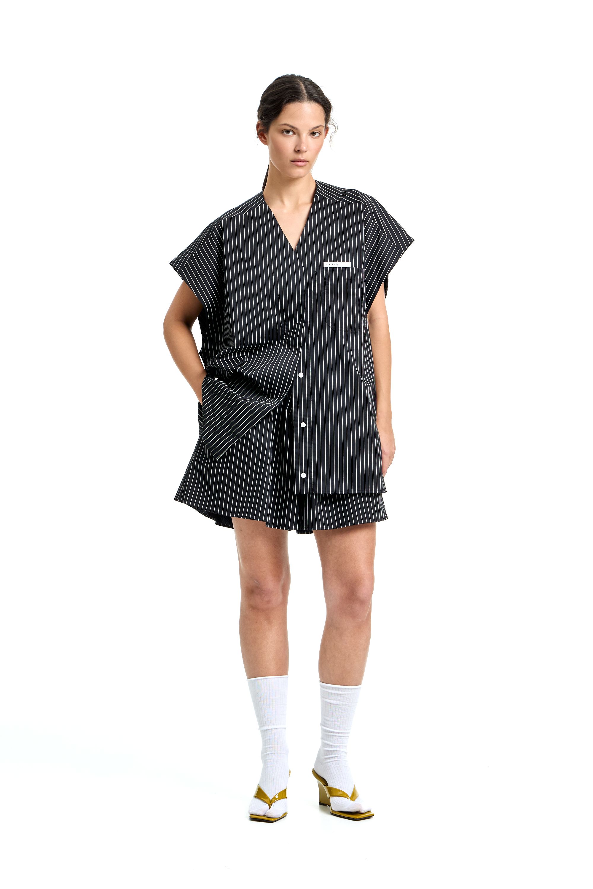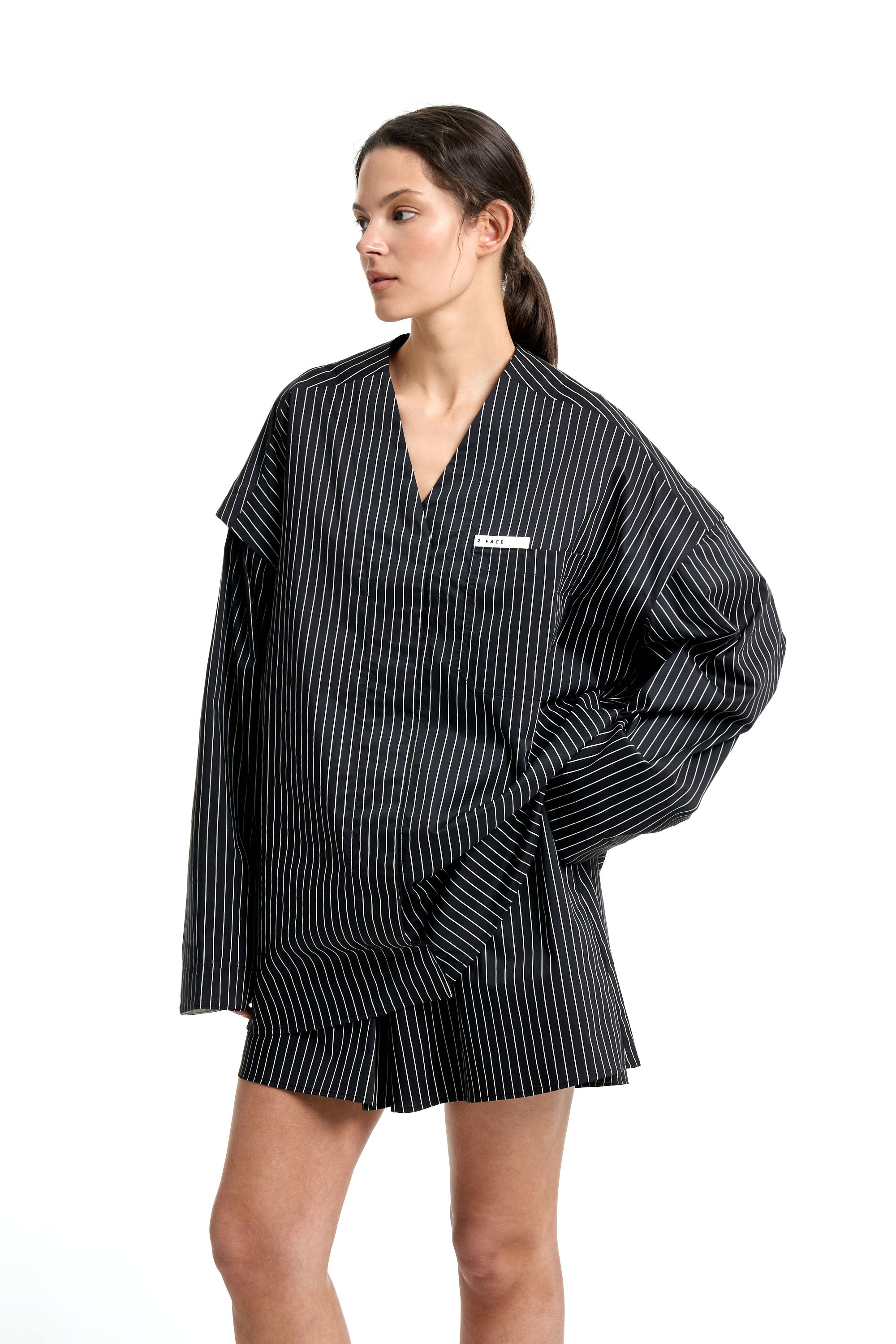 Комплект из рубашки и шорт в пижамном стиле. Рубашка с V-образным вырезом и отстегивающимися рукавами, что позволяет сделать короткий рукав. Нагрудный карман с нашивкой. Шорты на резинке с шлевками на поясе для ремня и пояса. Пояс в комплекте