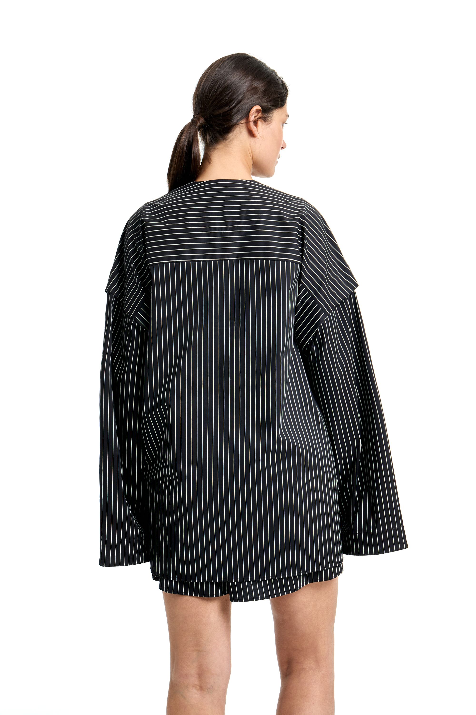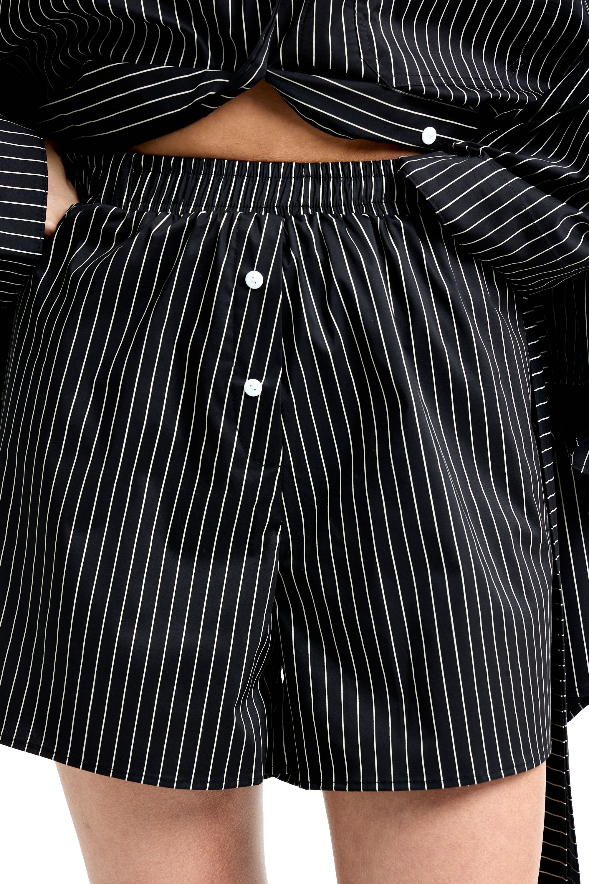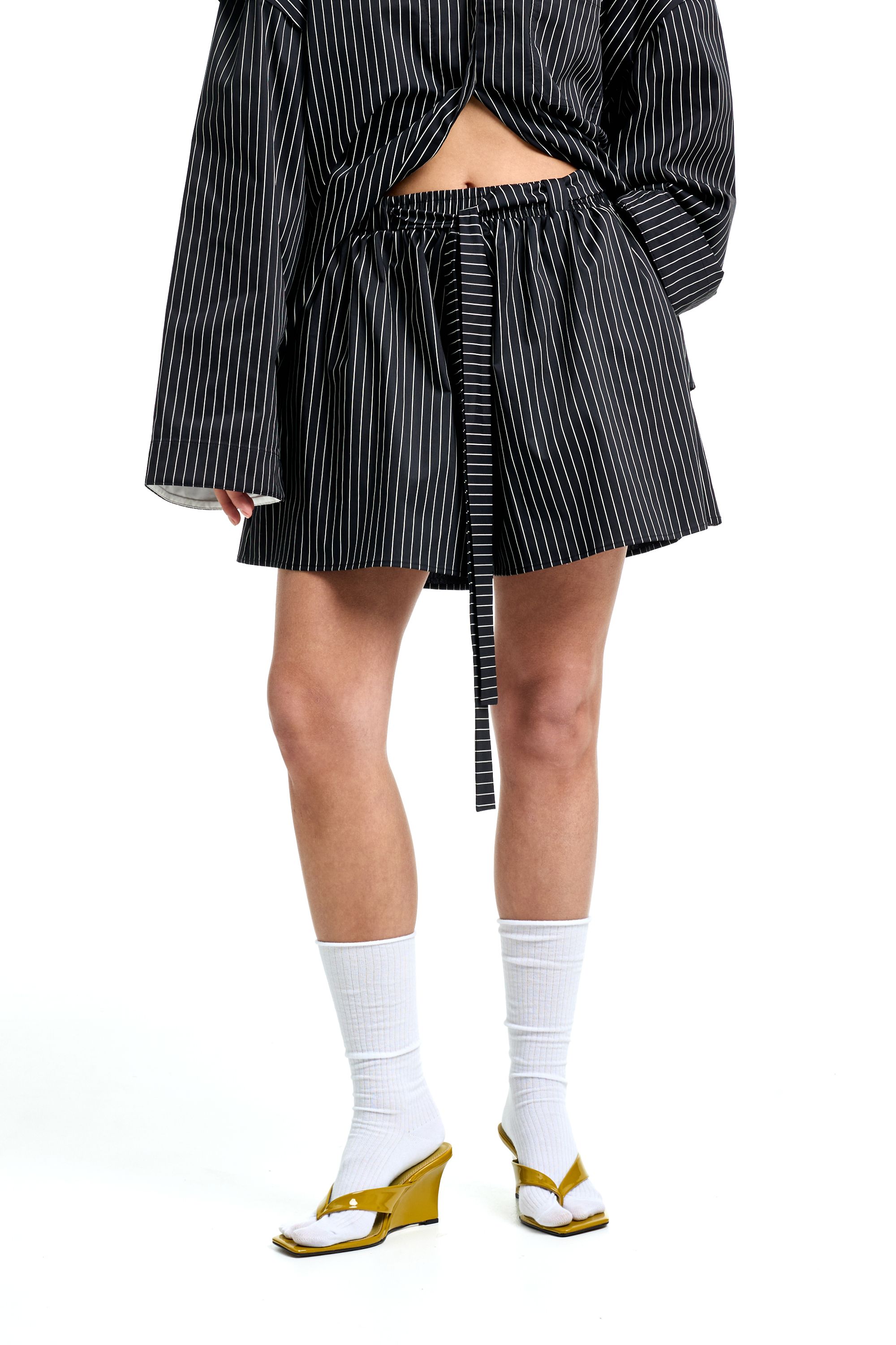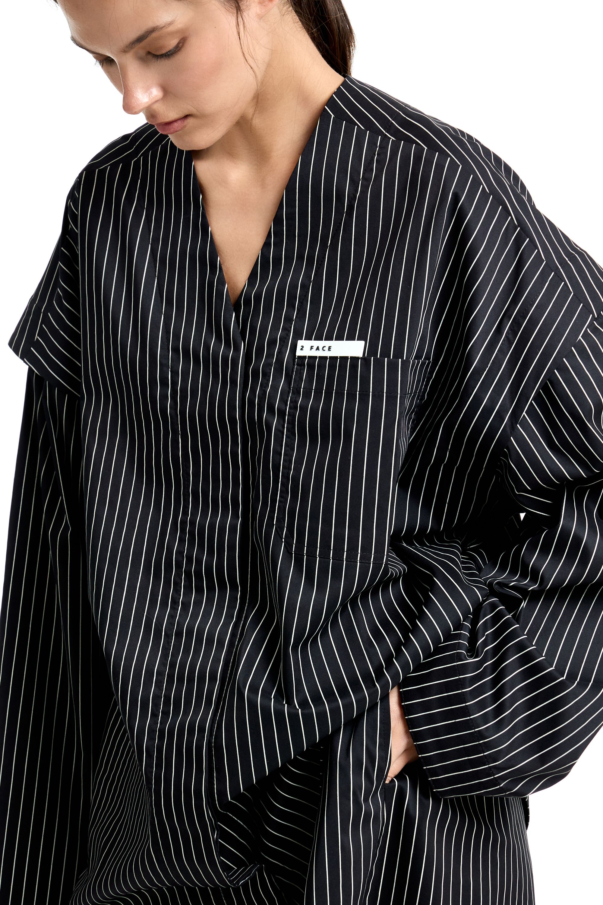 Комплект из рубашки и шорт в пижамном стиле. Рубашка с V-образным вырезом и отстегивающимися рукавами, что позволяет сделать короткий рукав. Нагрудный карман с нашивкой. Шорты на резинке с шлевками на поясе для ремня и пояса. Пояс в комплекте