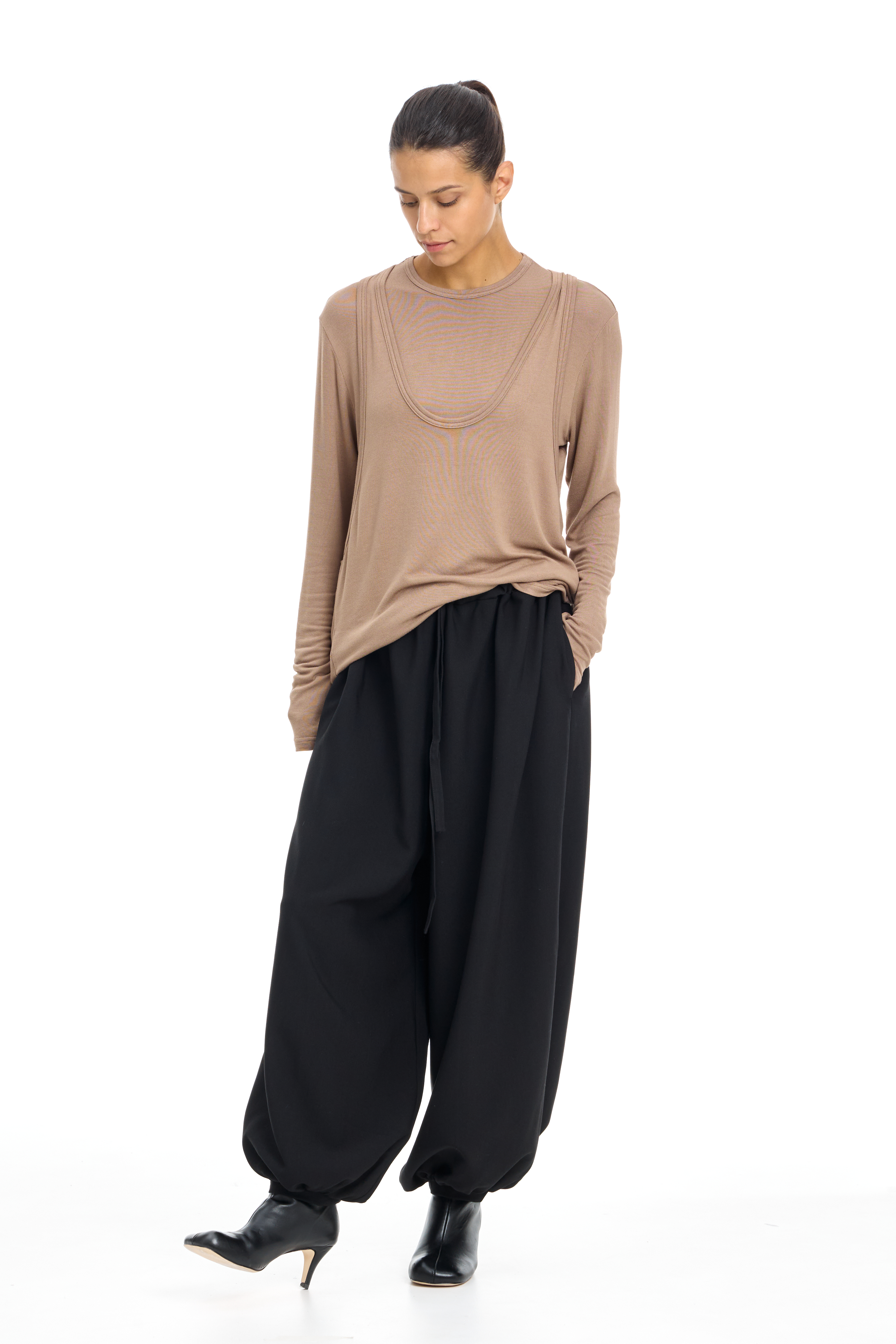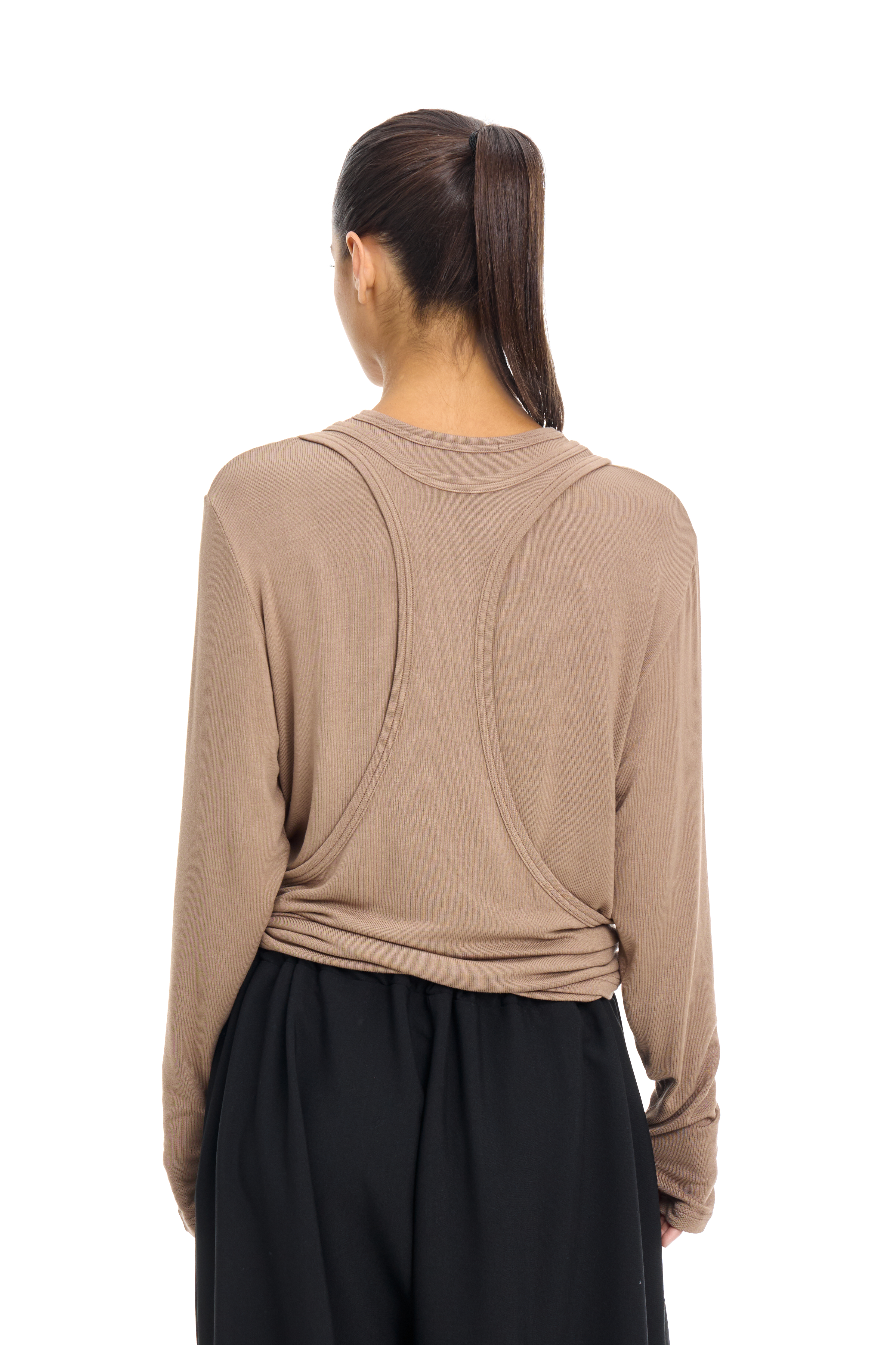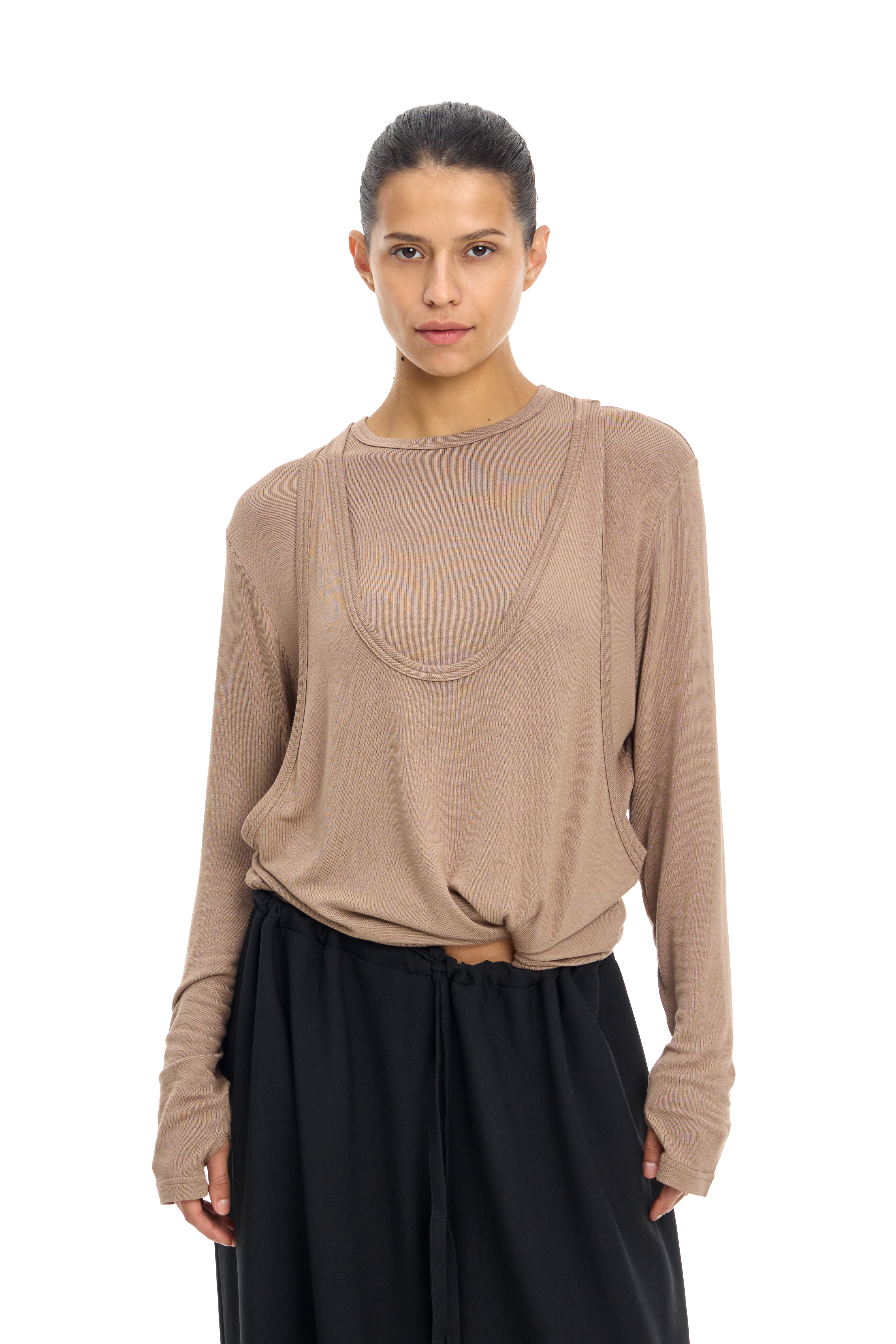 Изделие, которое состоит отдельно из лонгслива и майки. Два самодостаточных изделия в одном для создания вариативных образов. Полупрозрачный и тонкий трикотаж дарит ощущение второй кожи