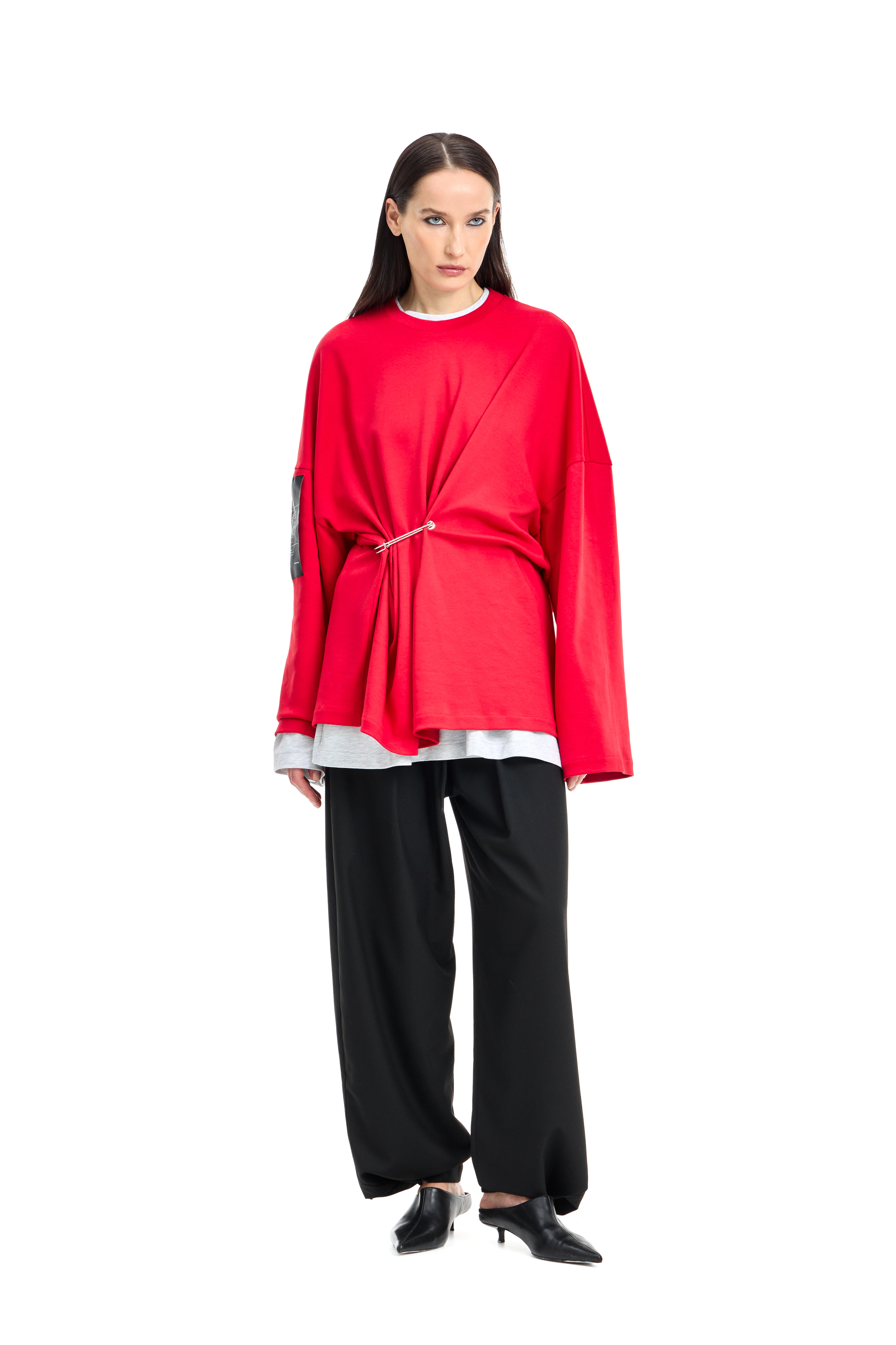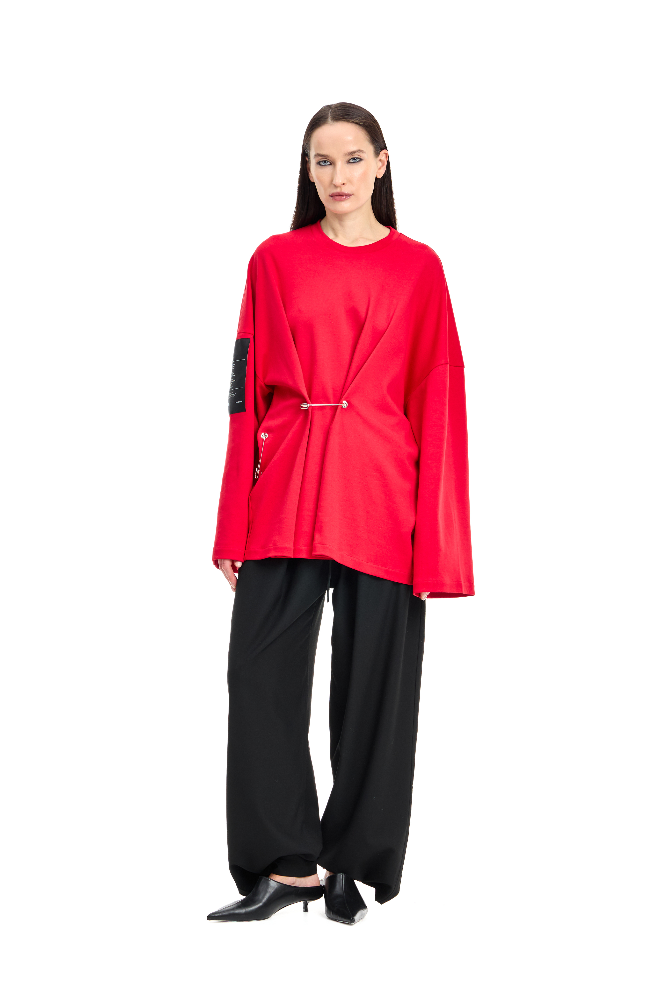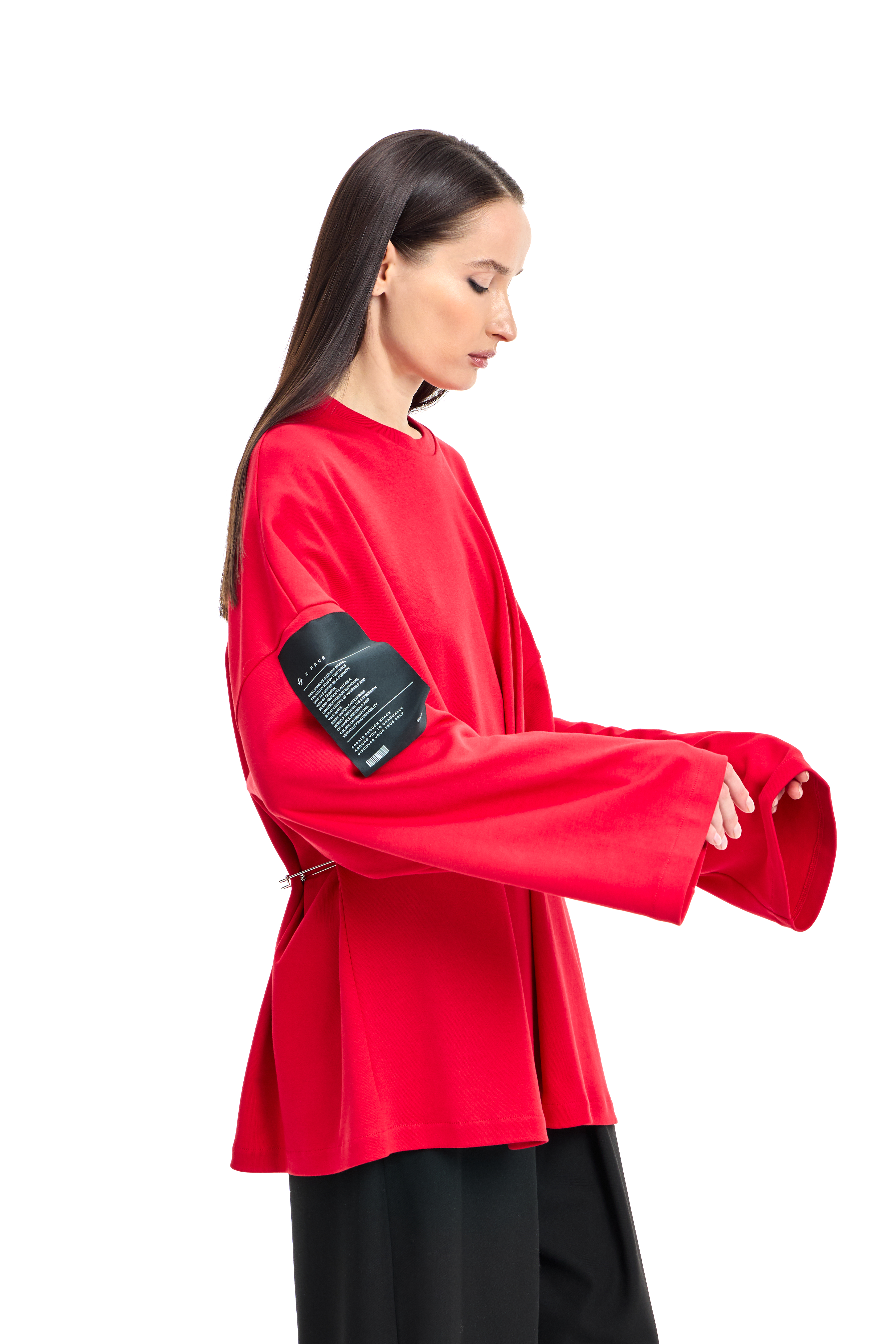 Лонгслив с люверсами цвета металл и с аксессуарами «булавки», которые идут в комплекте. Фирменная нашивка на рукаве. Смело экспериментируйте и самовыражайтесь