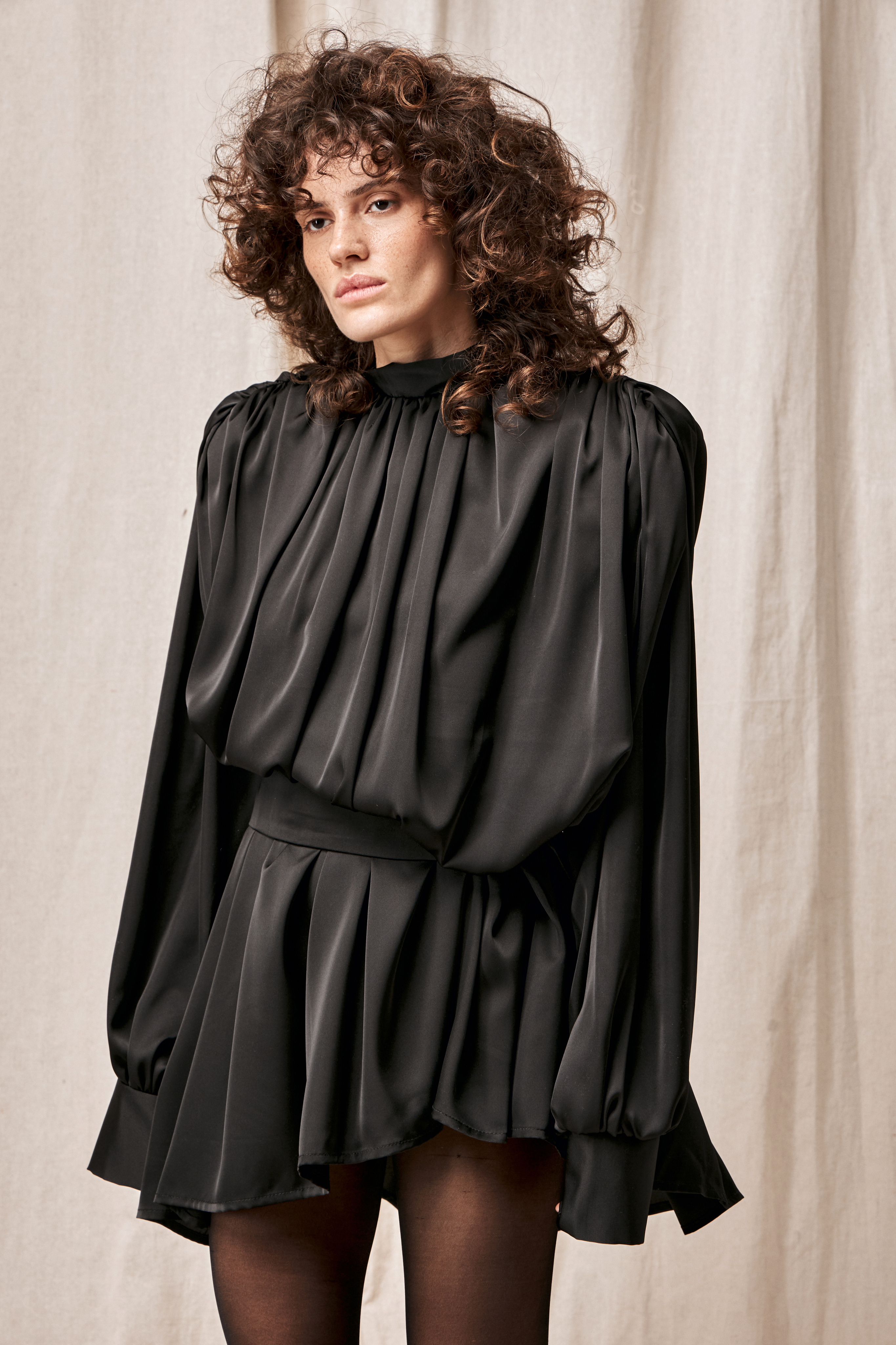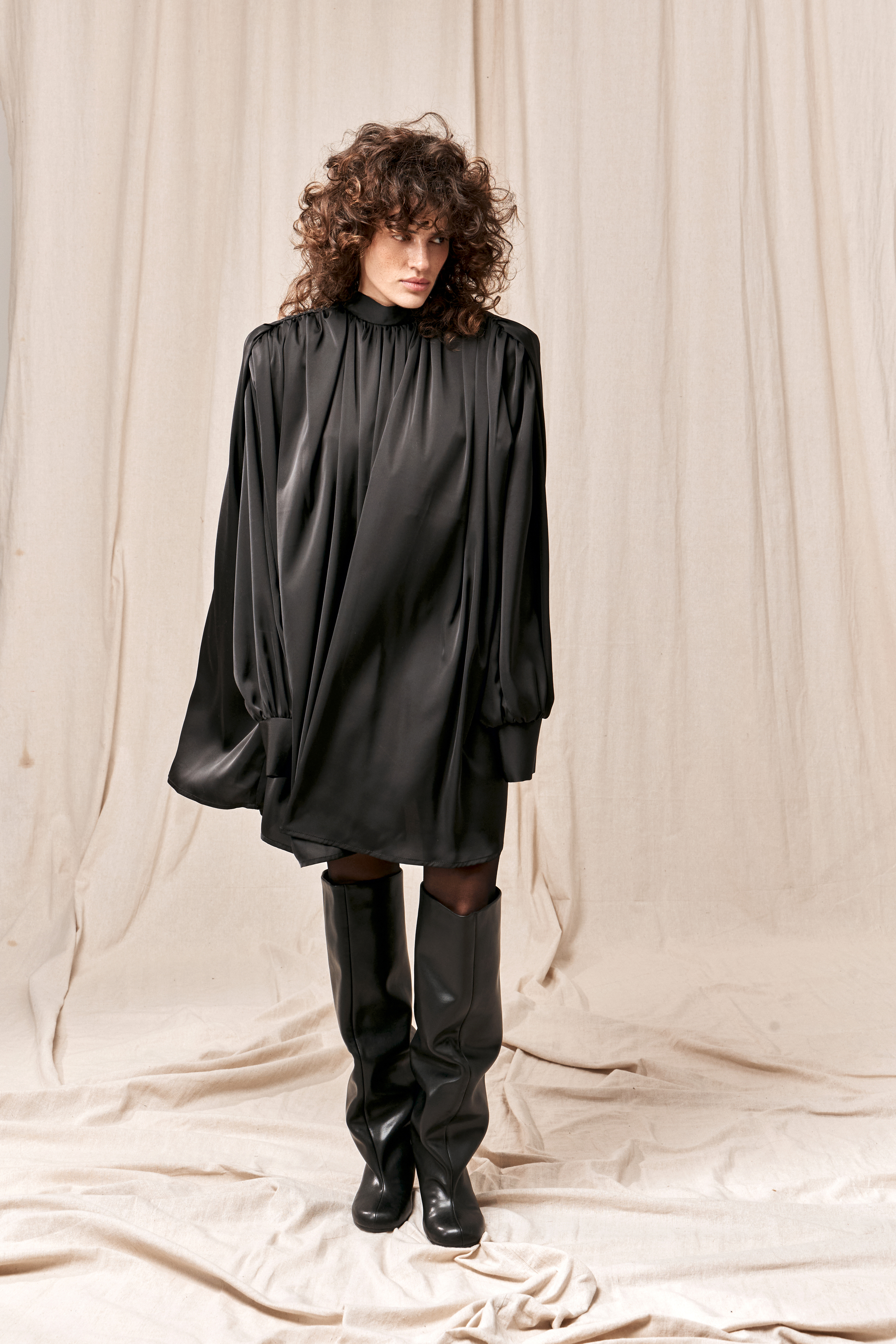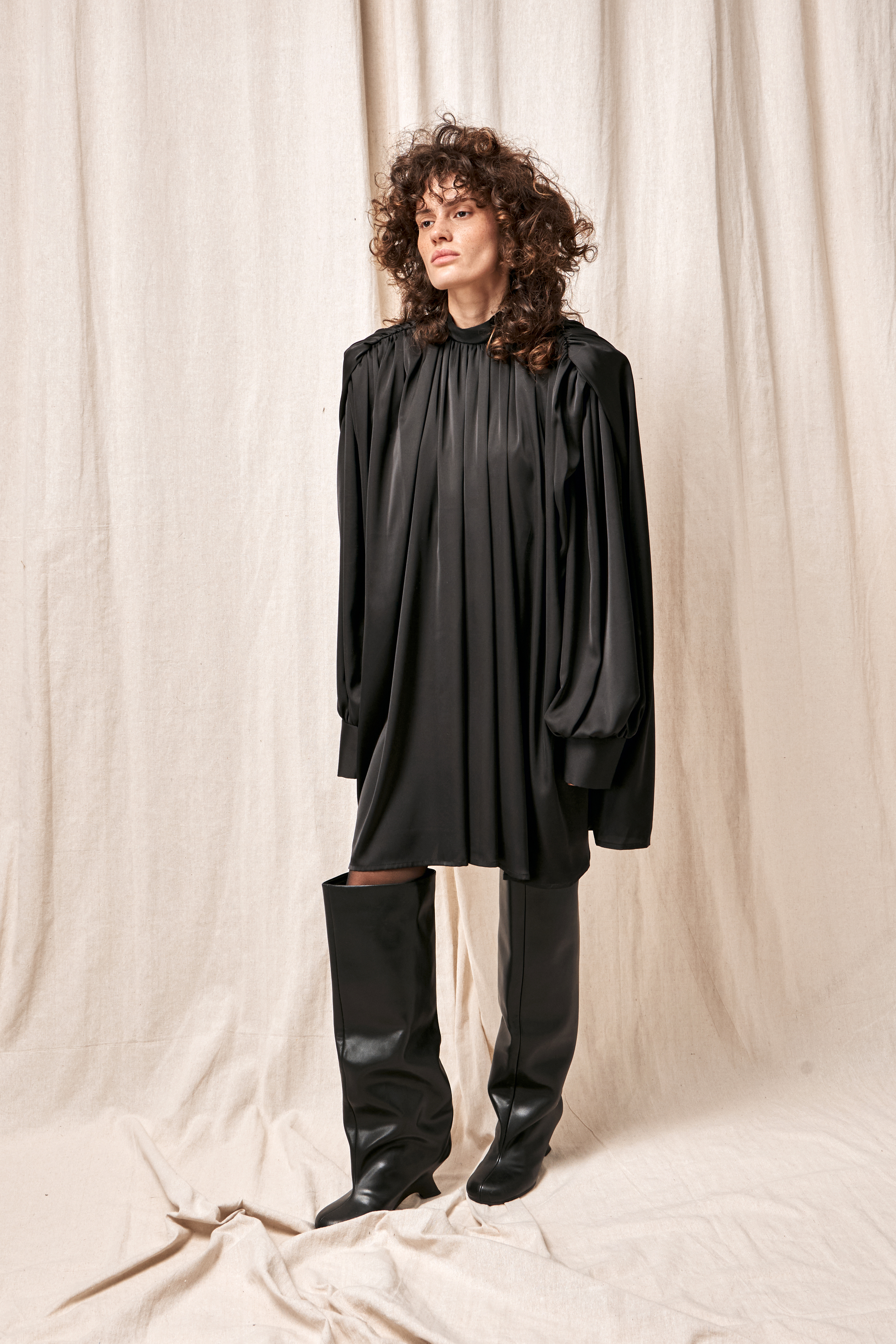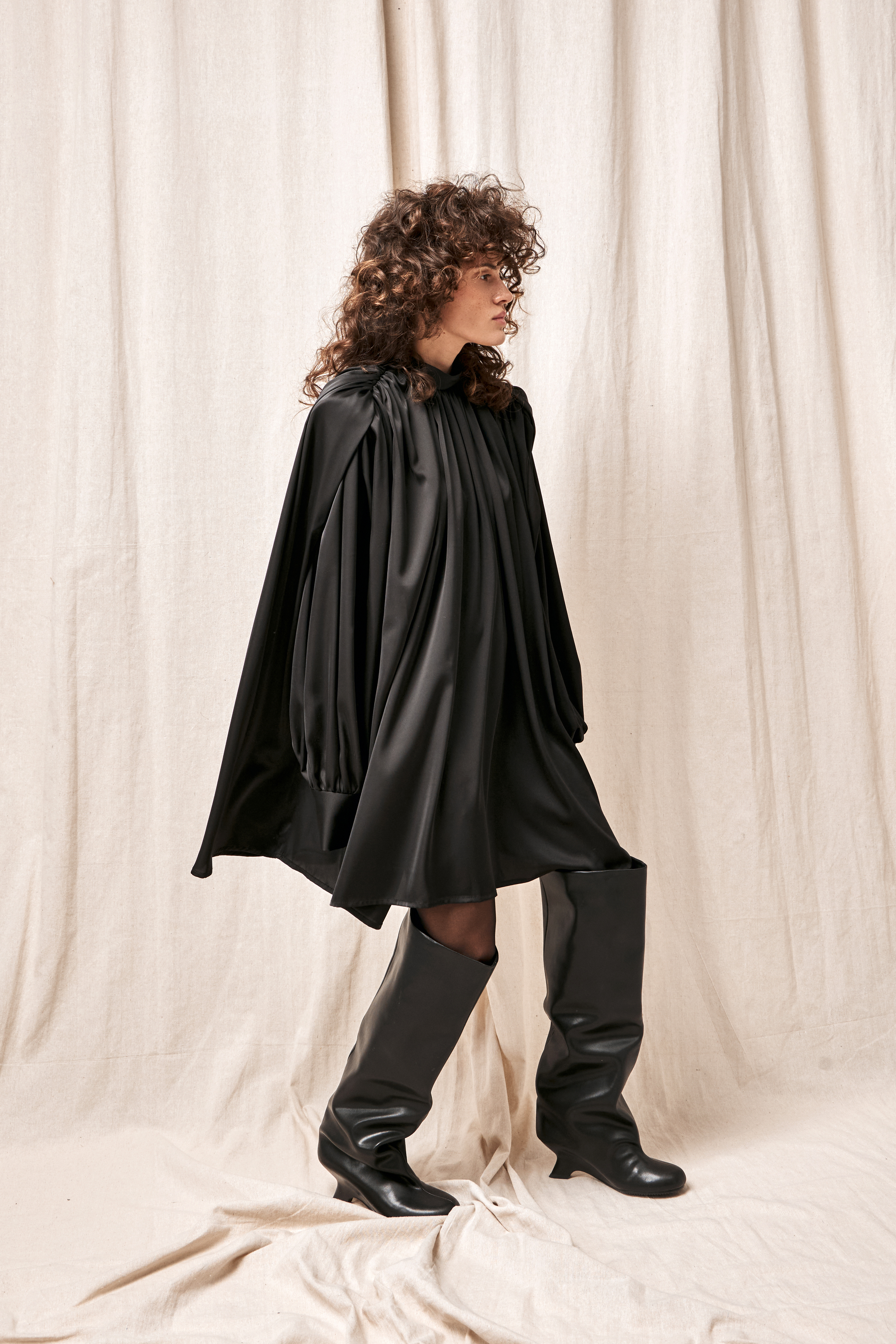 Для натур, кто знает, что истинная элегантность кроется в деталях: платье-блуза с акцентными плечами в стиле кейп. Плечи, словно крылья, мягко ниспадают, добавляя изделию особую грацию