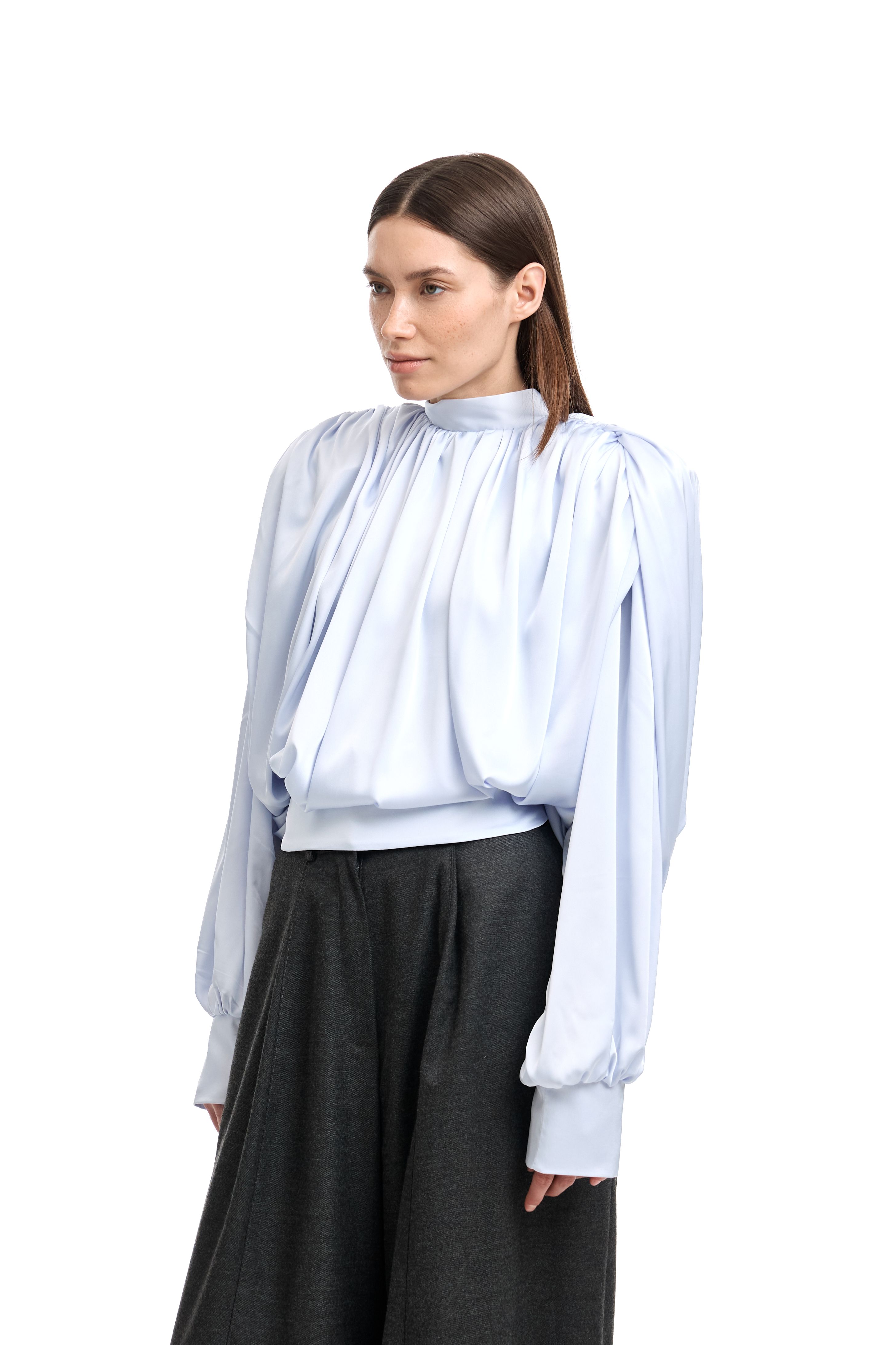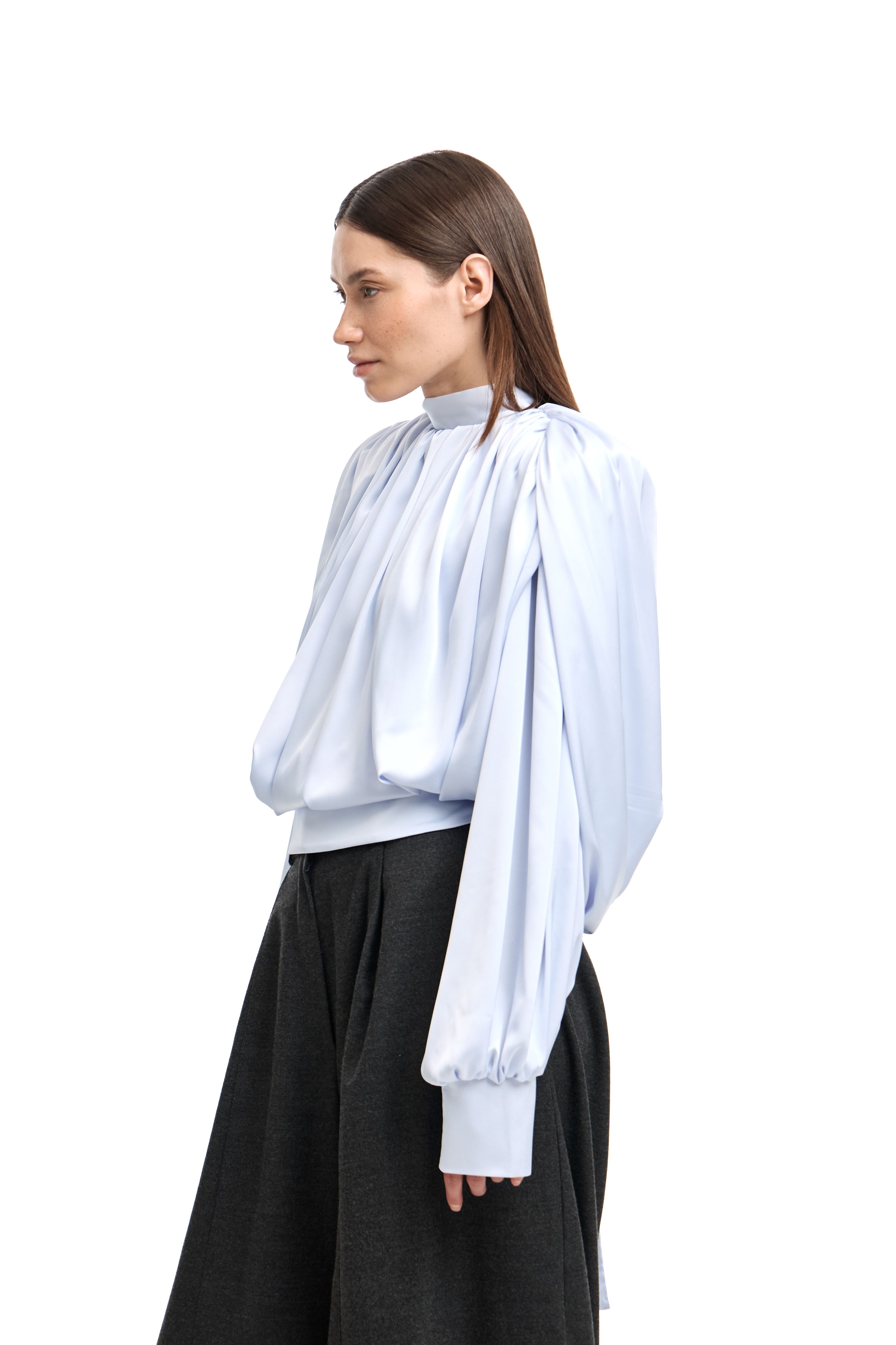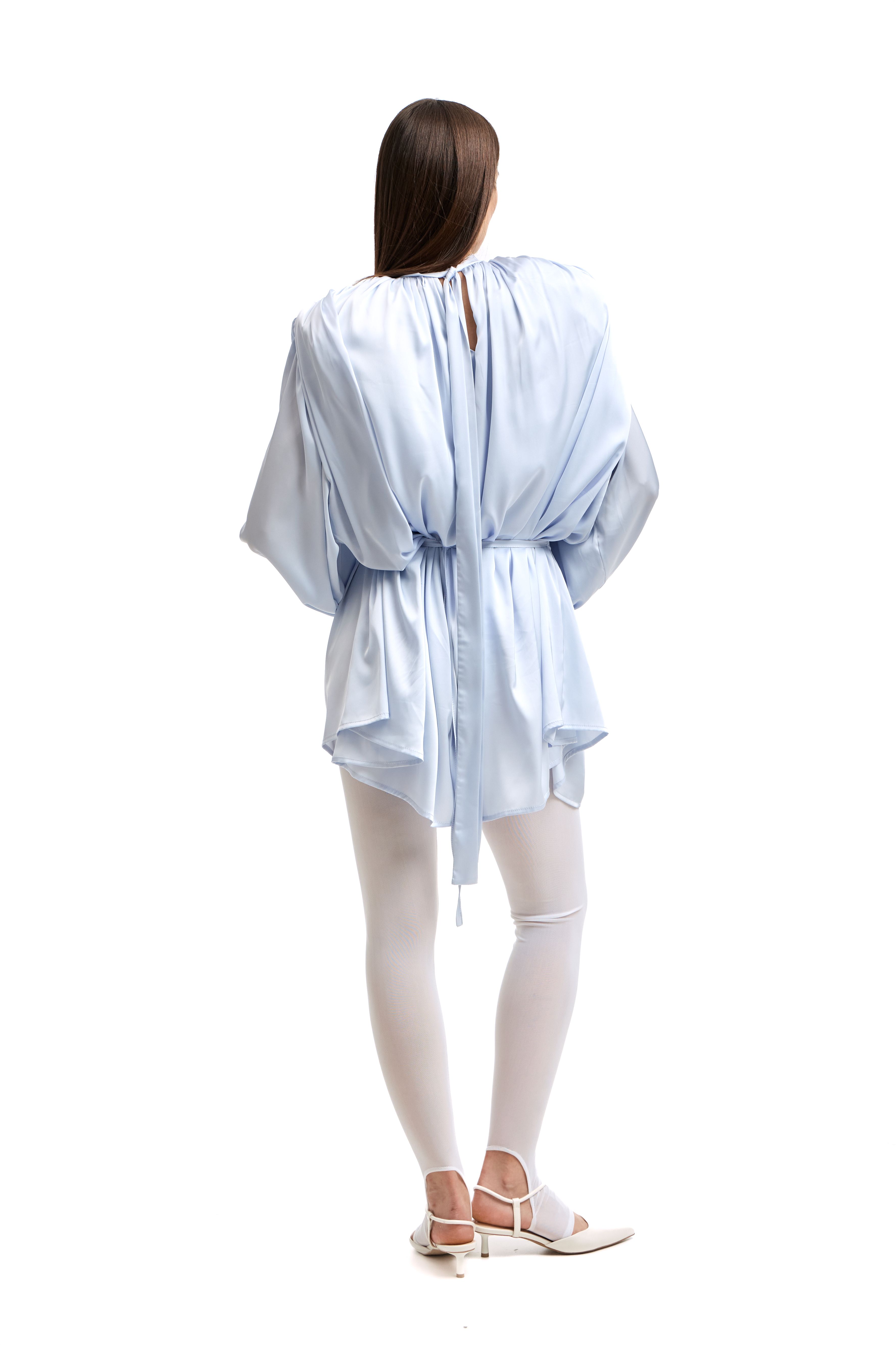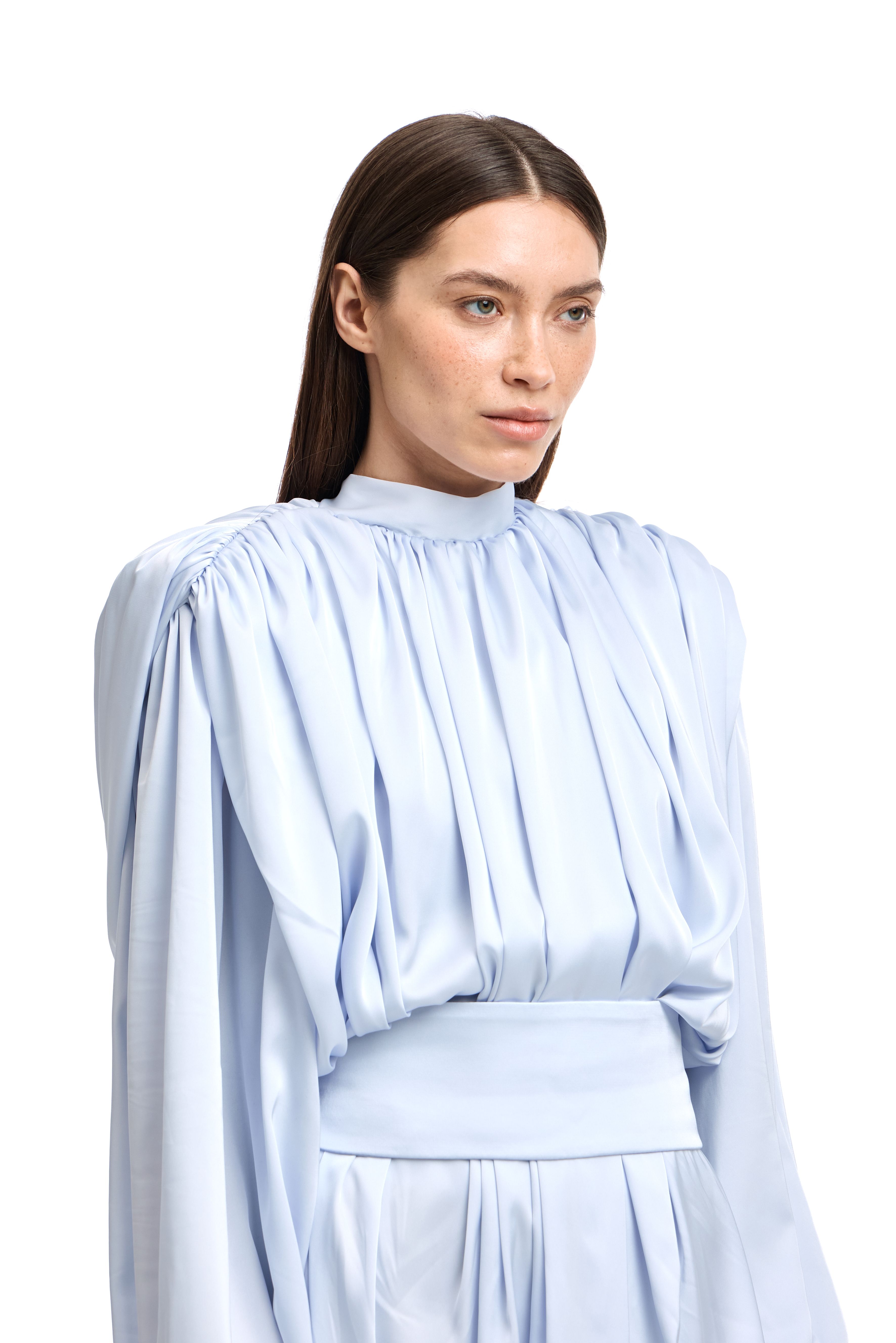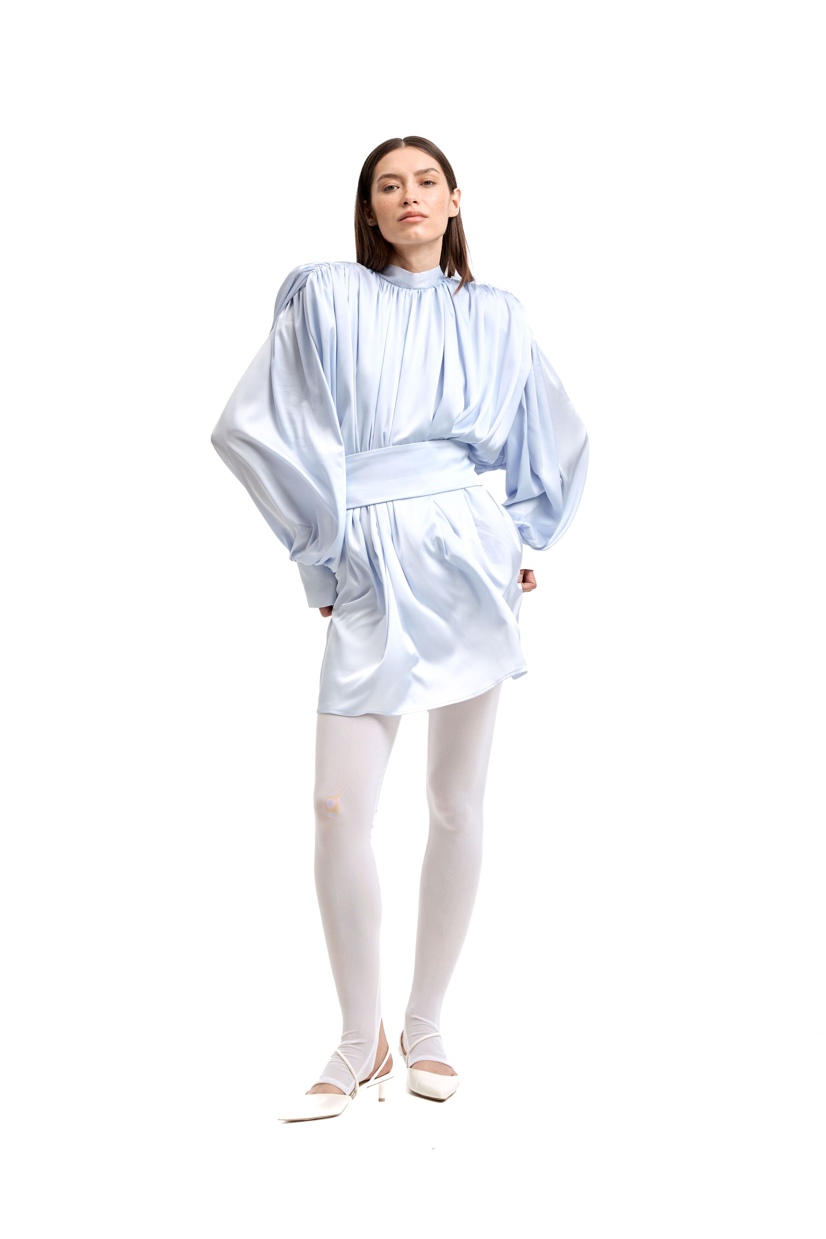 Для натур, кто знает, что истинная элегантность кроется в деталях: платье-блуза с акцентными плечами в стиле кейп. Плечи, словно крылья, мягко ниспадают, добавляя изделию особую грацию