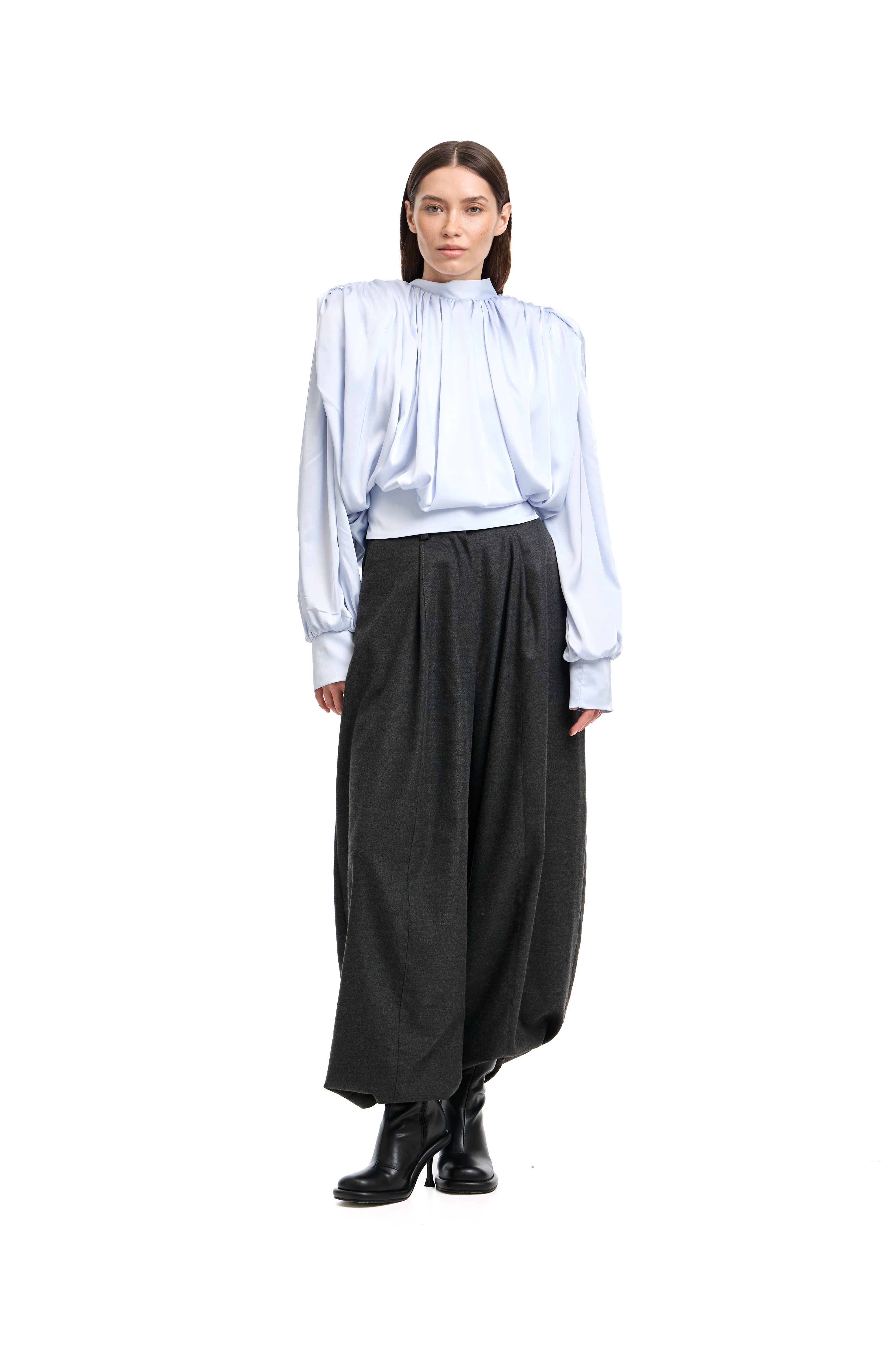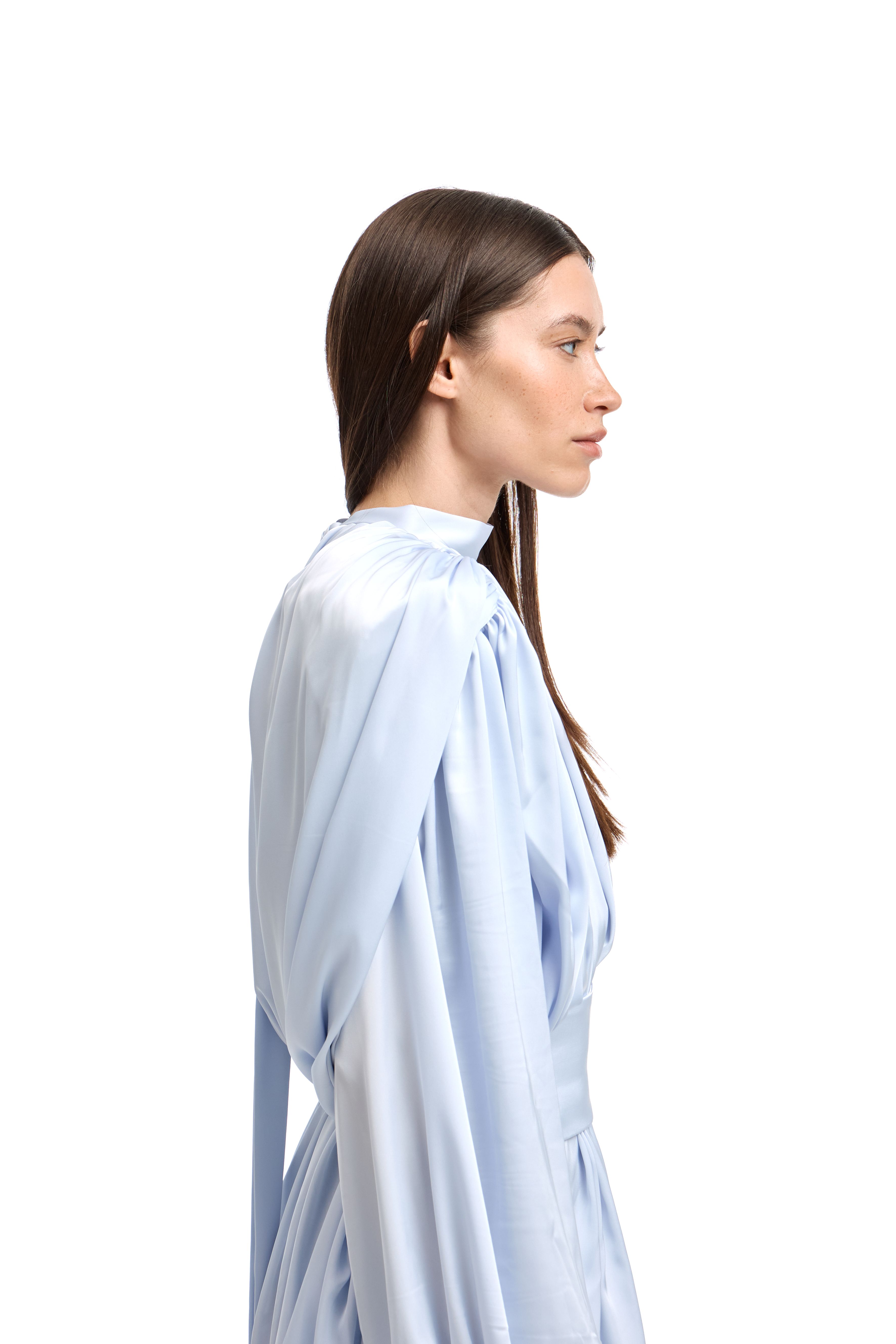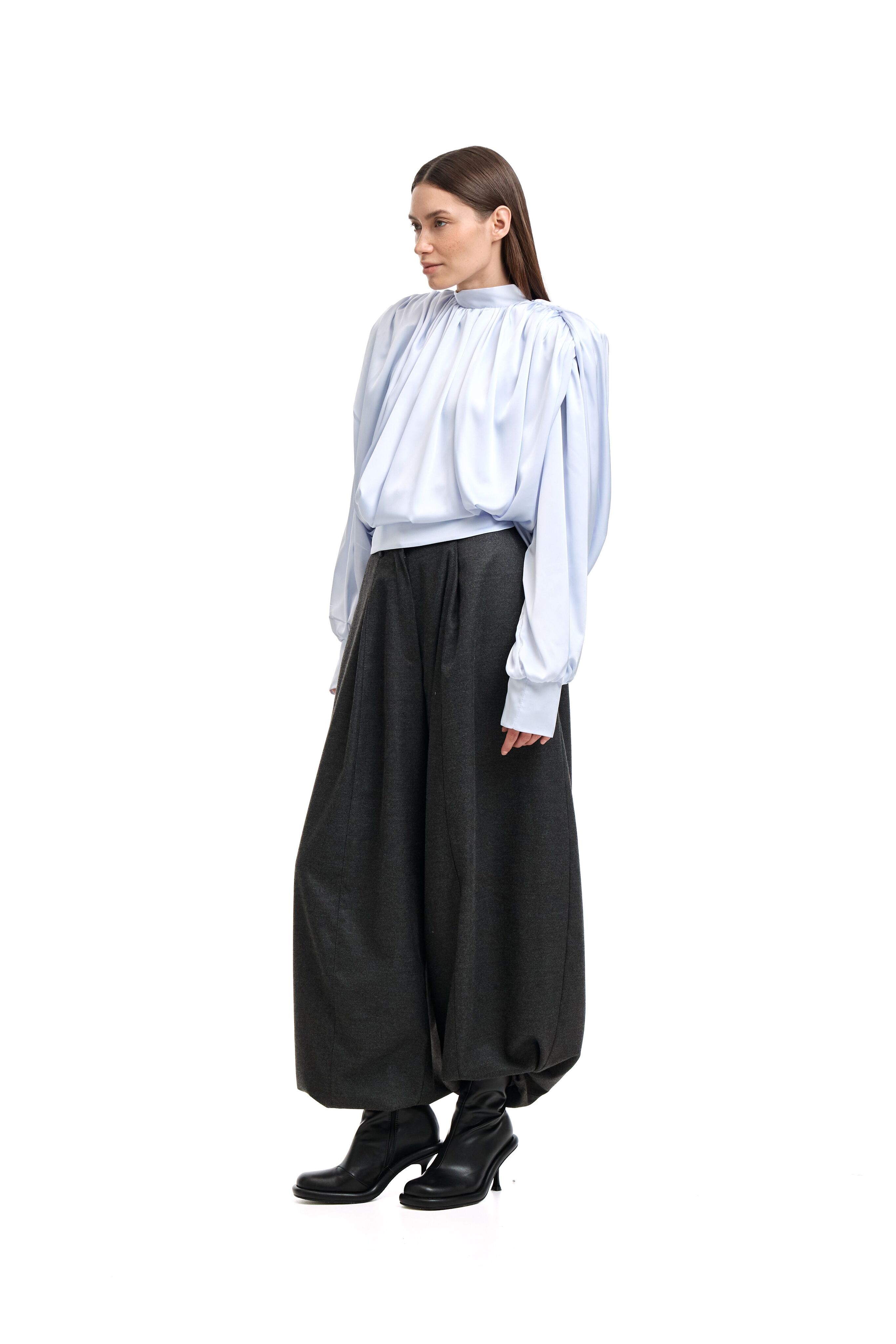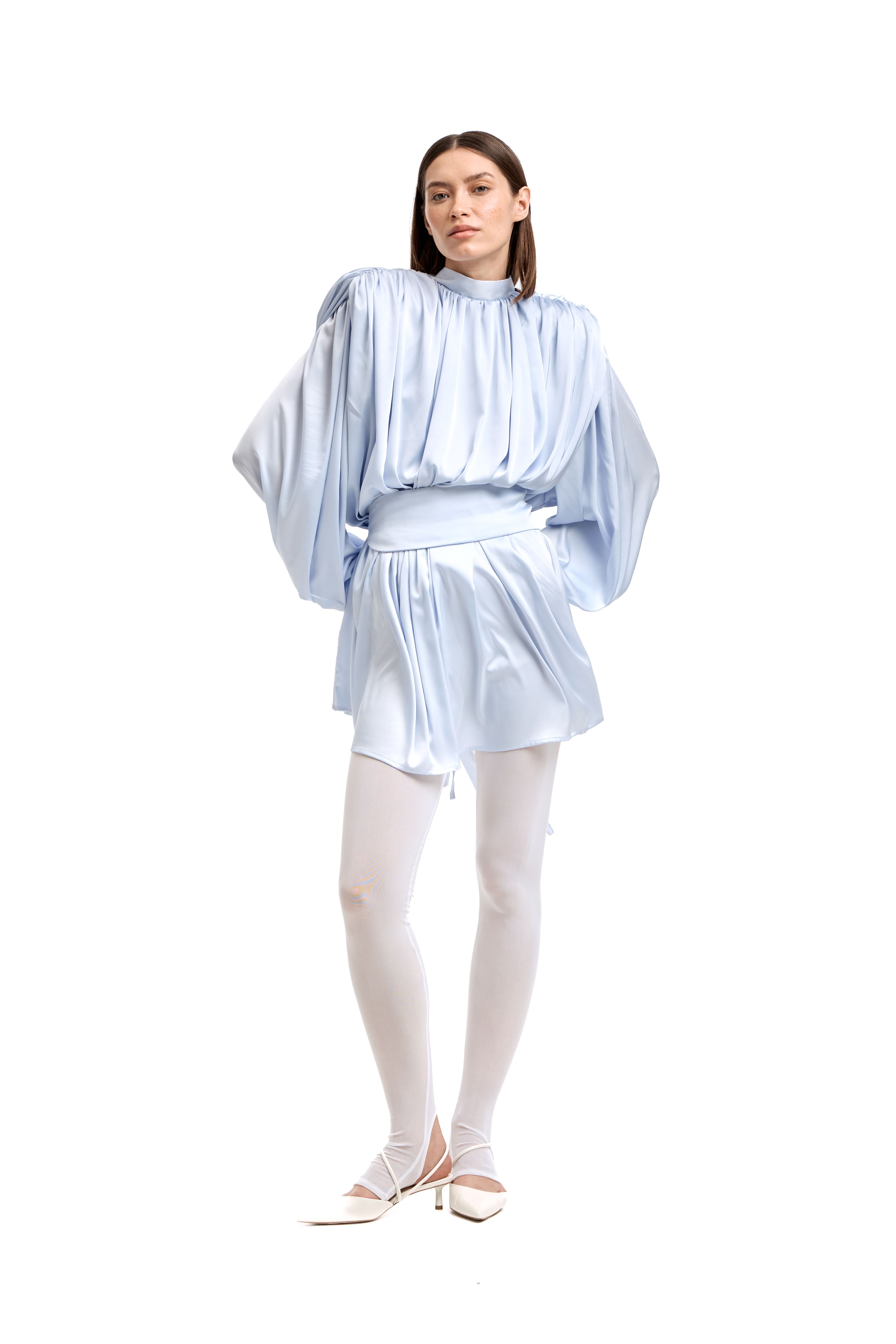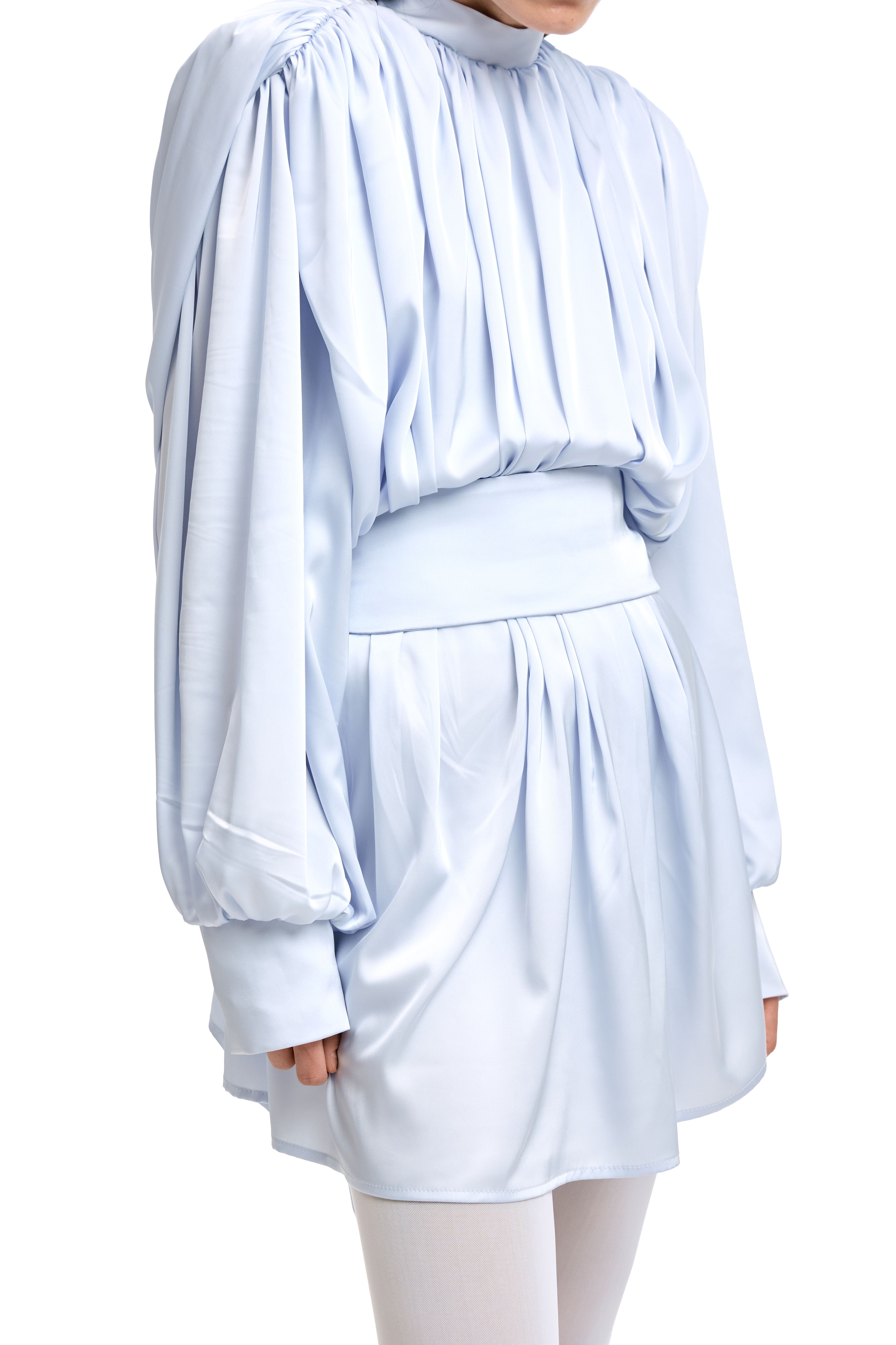 Для натур, кто знает, что истинная элегантность кроется в деталях: платье-блуза с акцентными плечами в стиле кейп. Плечи, словно крылья, мягко ниспадают, добавляя изделию особую грацию