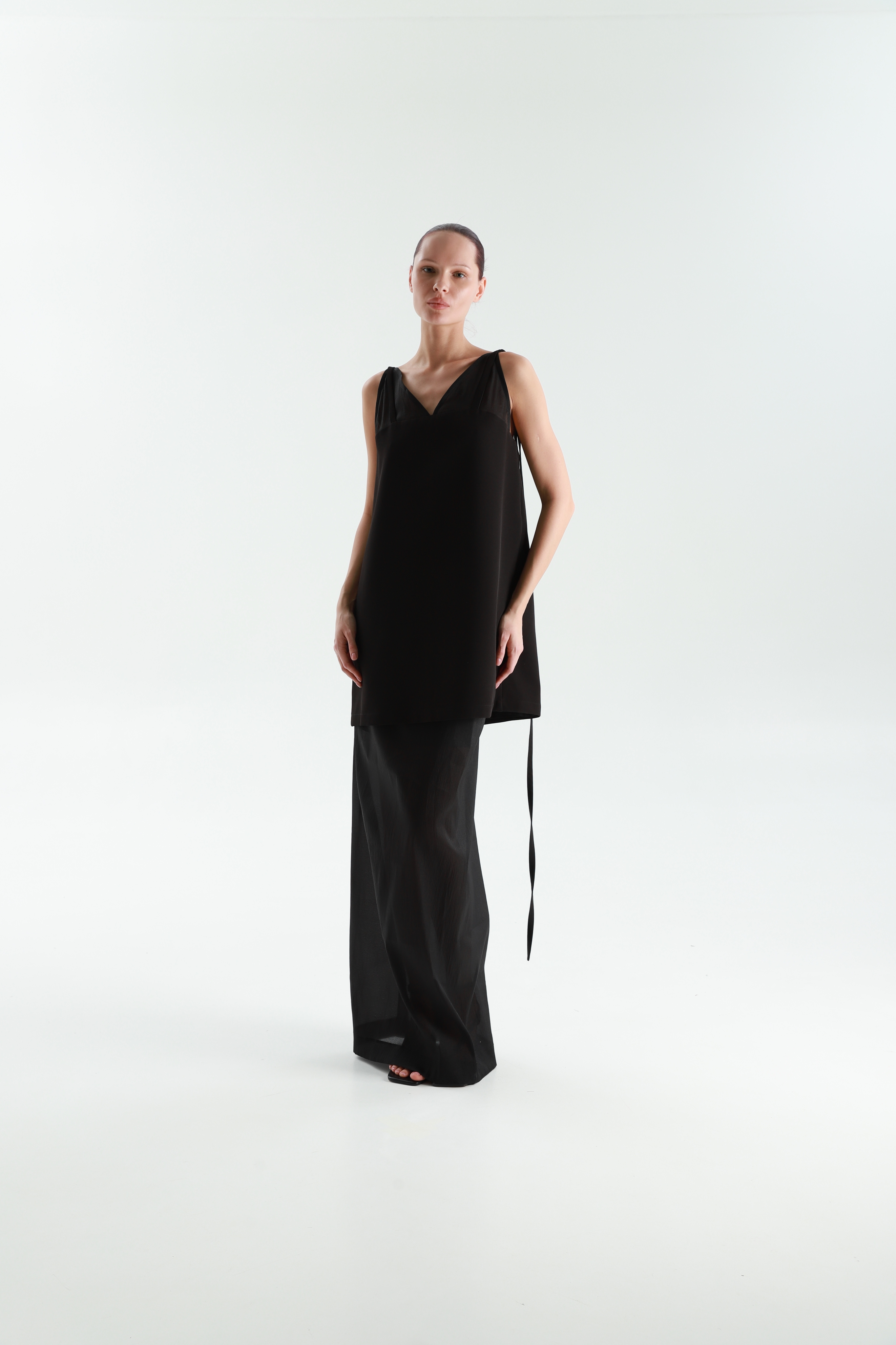 Платье мини со вставками из тафты и лентами, которые придают динамики образу.