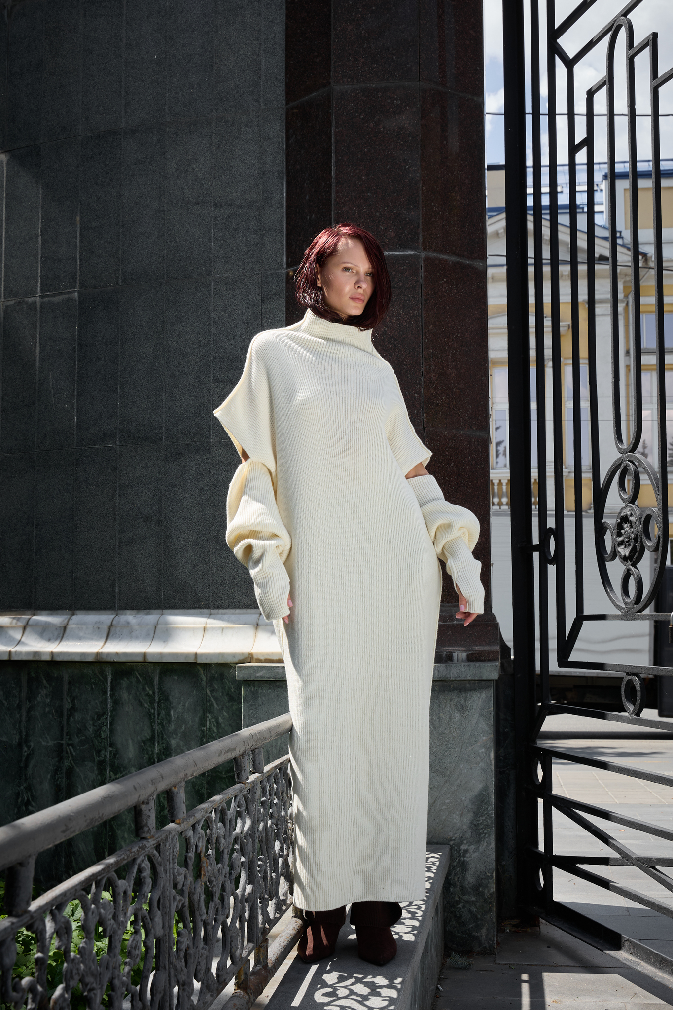 Вязанное платье с воротом. Рукава-митенки отстегиваются. Застежки на пуговицах.