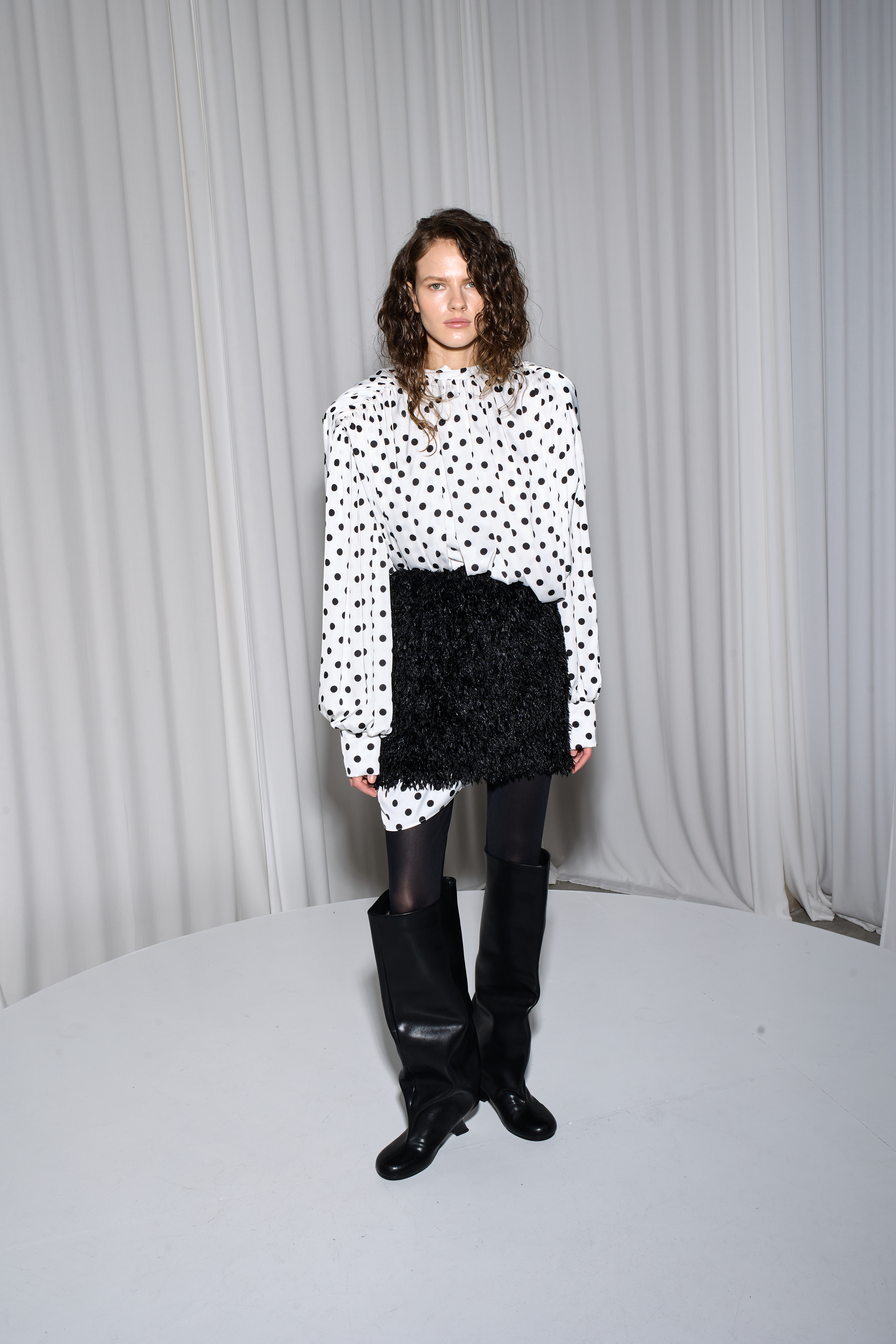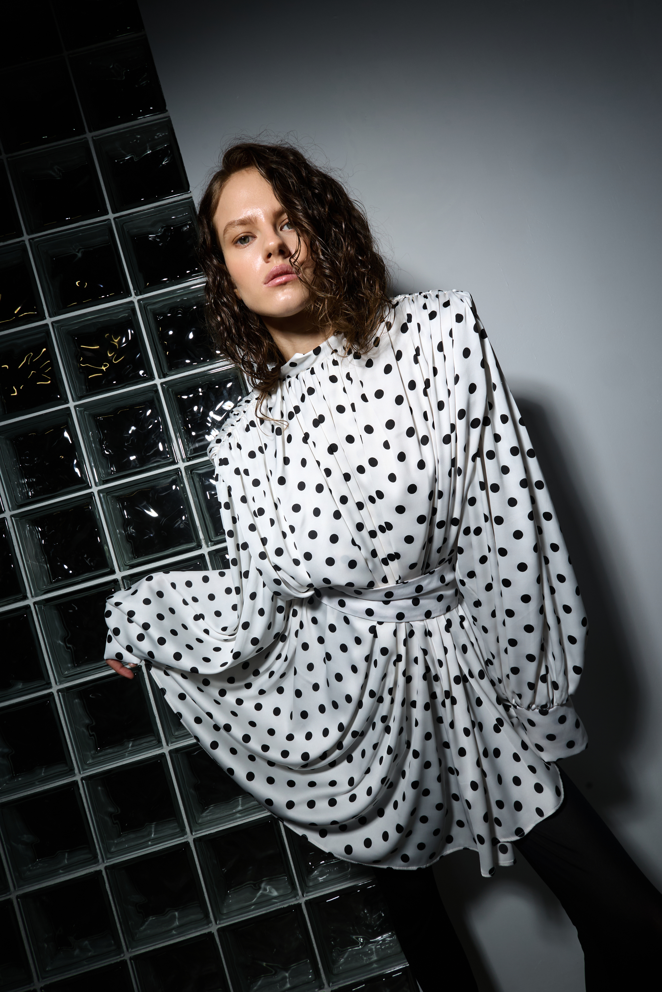 Для натур, кто знает, что истинная элегантность кроется в деталях: платье-блуза в горох с акцентными плечами в стиле кейп. Плечи, словно крылья, мягко ниспадают, добавляя изделию особую грацию