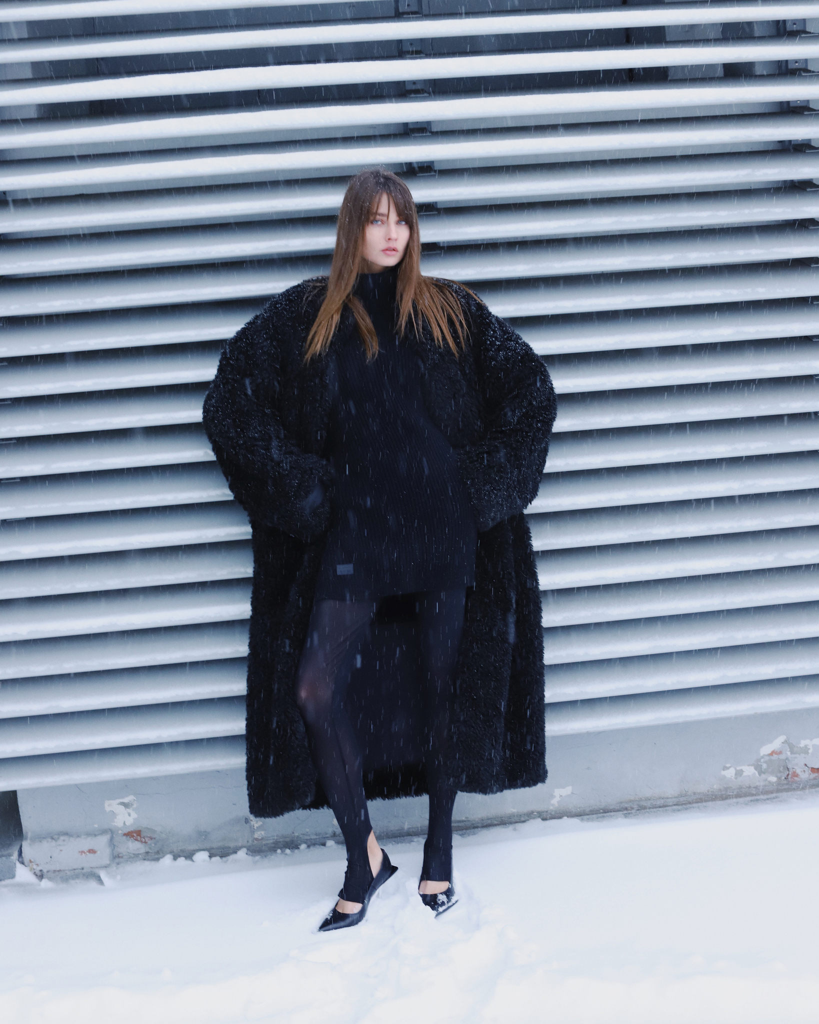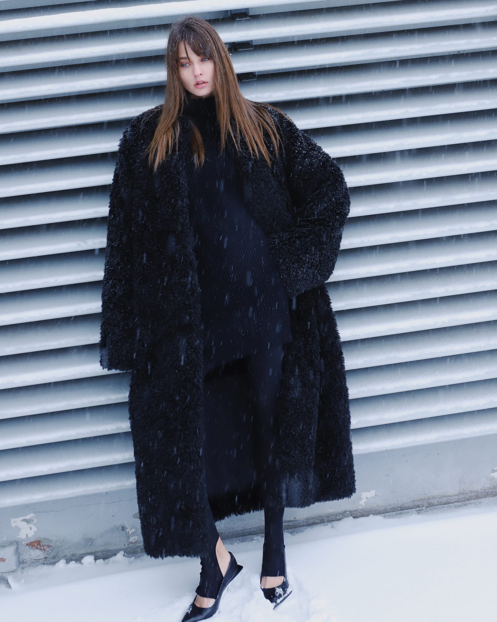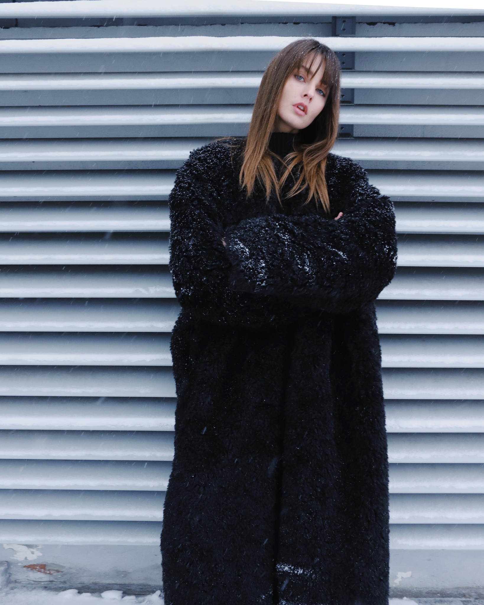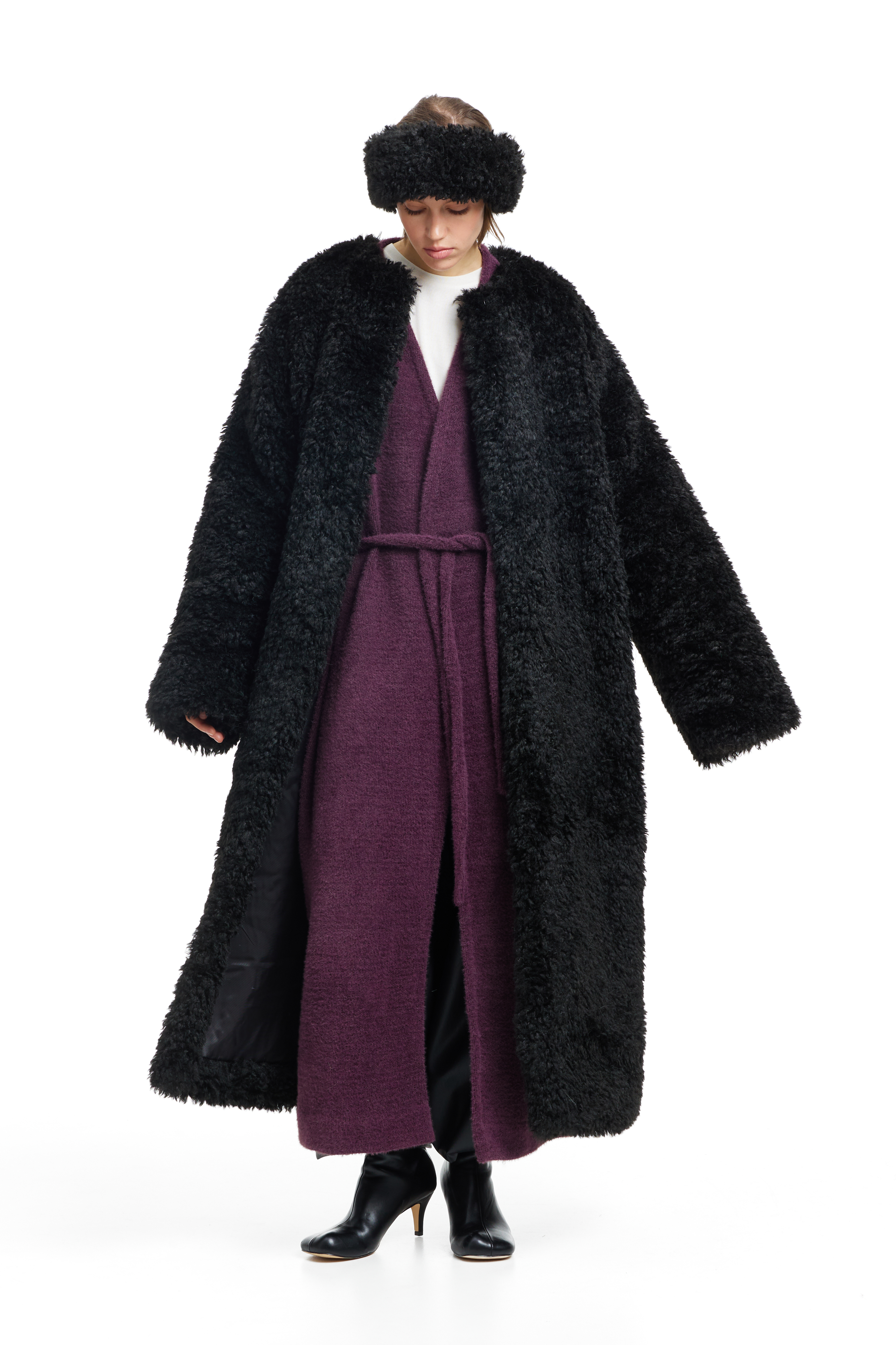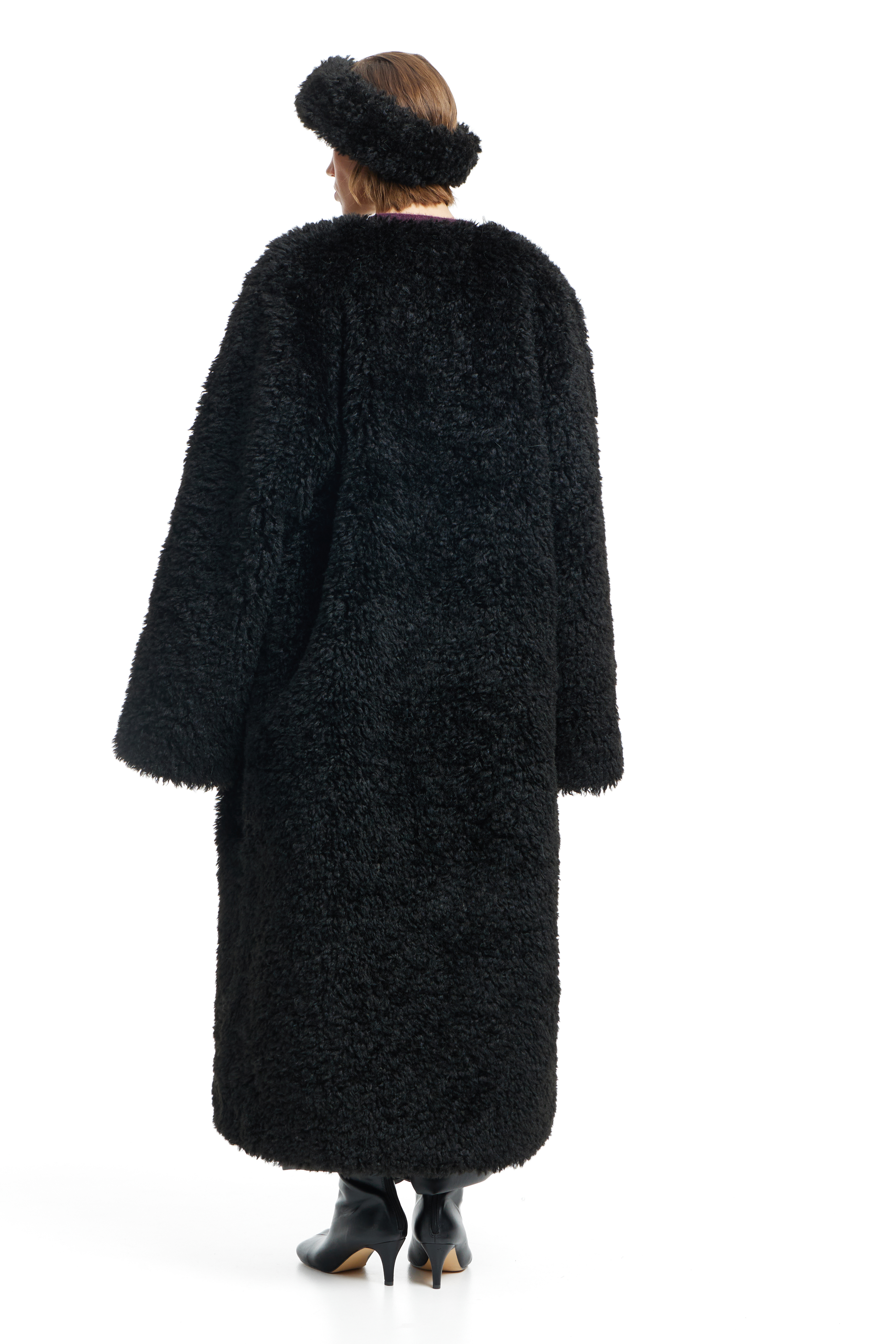 Шуба в длине макси из очень мягкого и кудрявого экомеха. Застежка на крючки с защелкой. Боковые и внутренний карманы. Утеплитель - холлофан. В комплекте съемный ворот-повязка