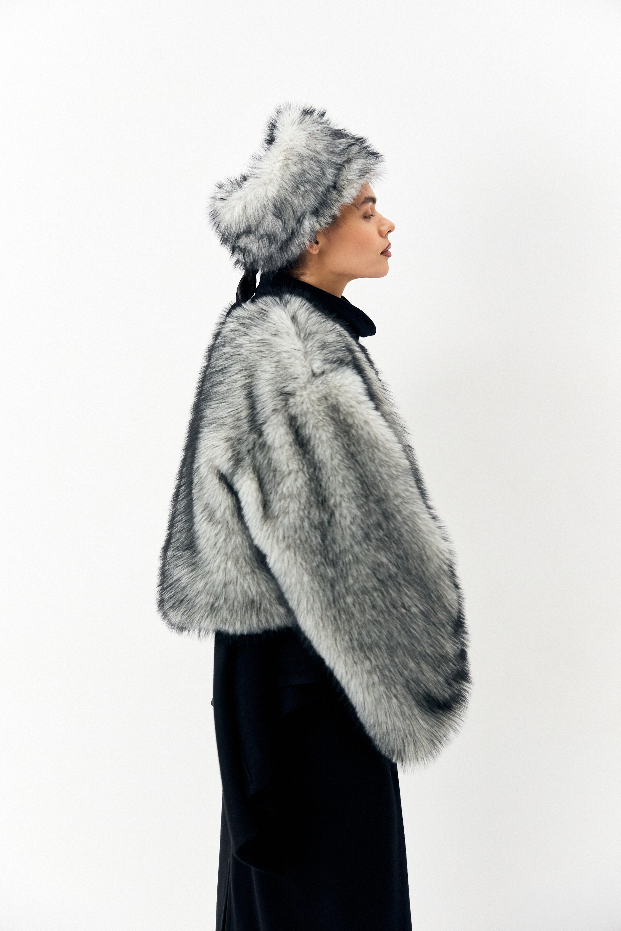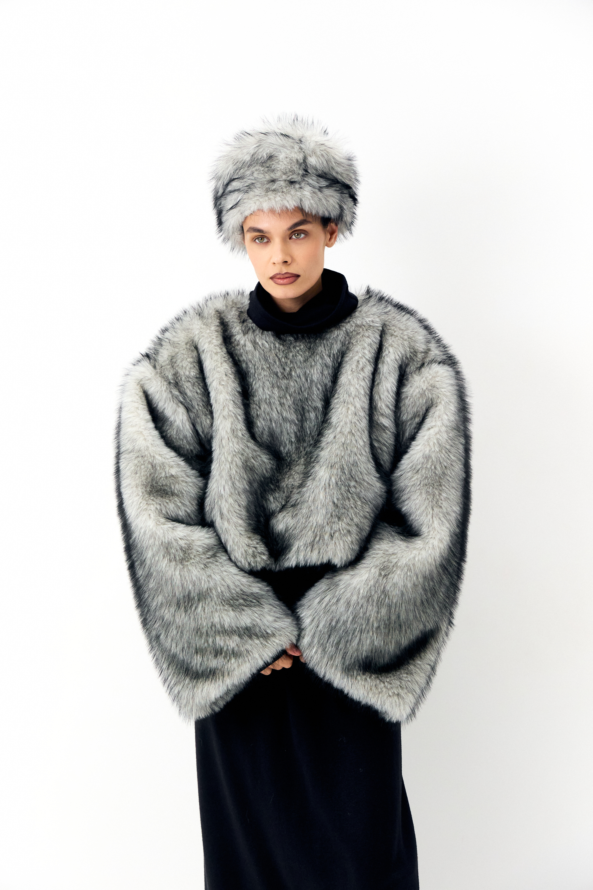 Шуба из эко-меха со съемным воротом-муфтой и отстегивающимся низом из плащевой ткани. Отстегивающийся низ можно носить как баску
