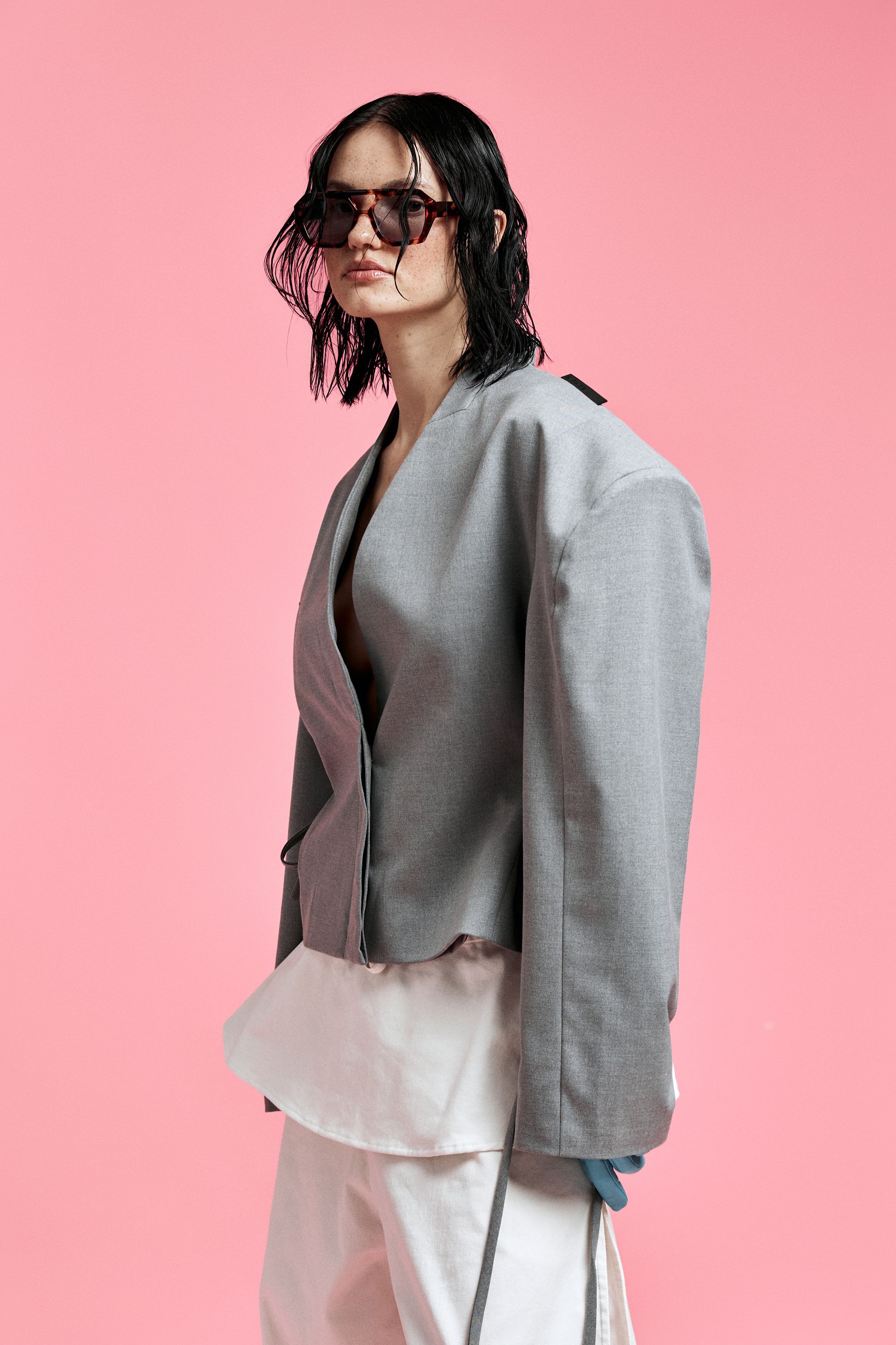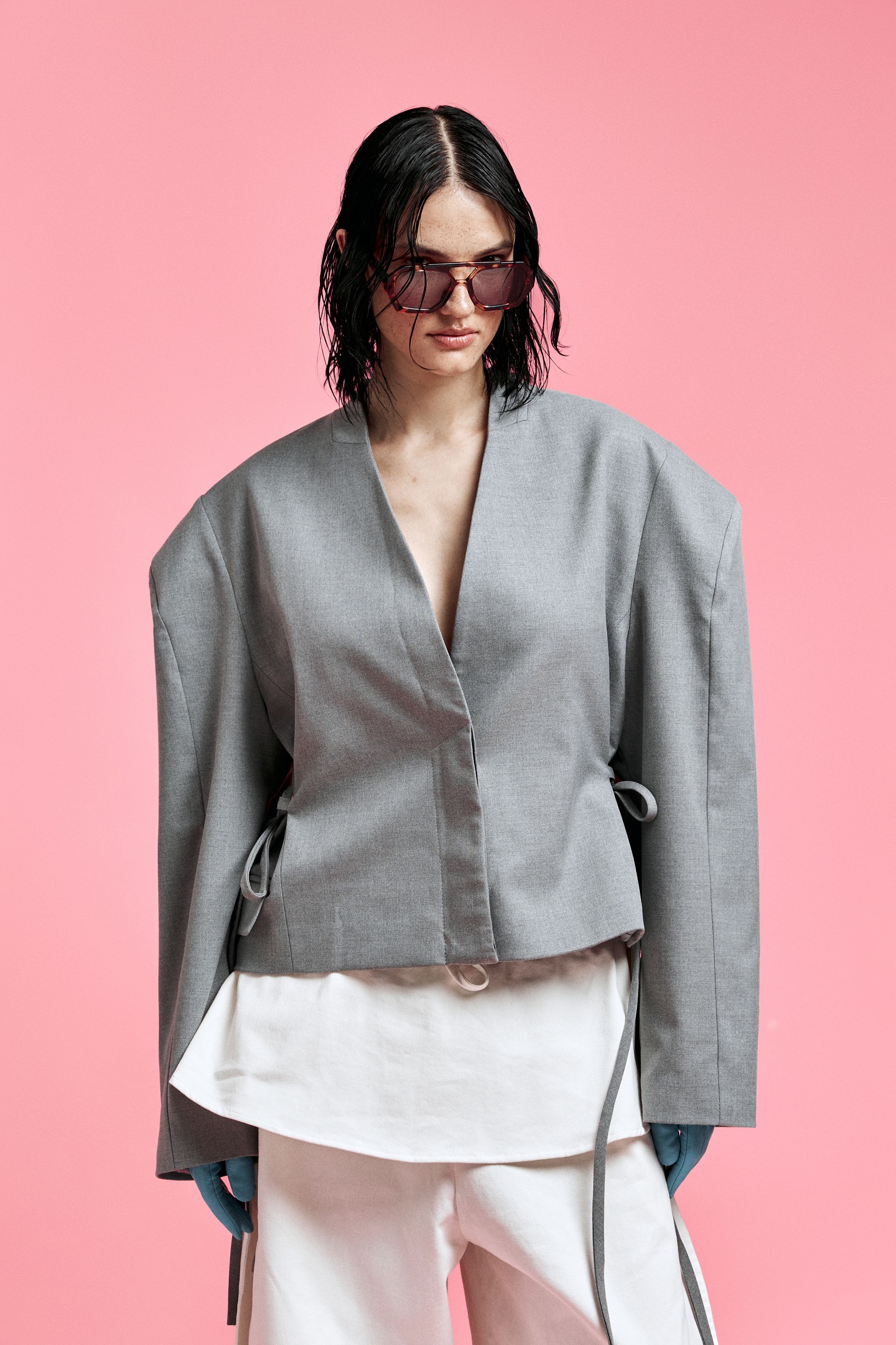 Прямой укороченный жакет с шалевым воротником и боковыми шнурками для создания приталенного силуэта